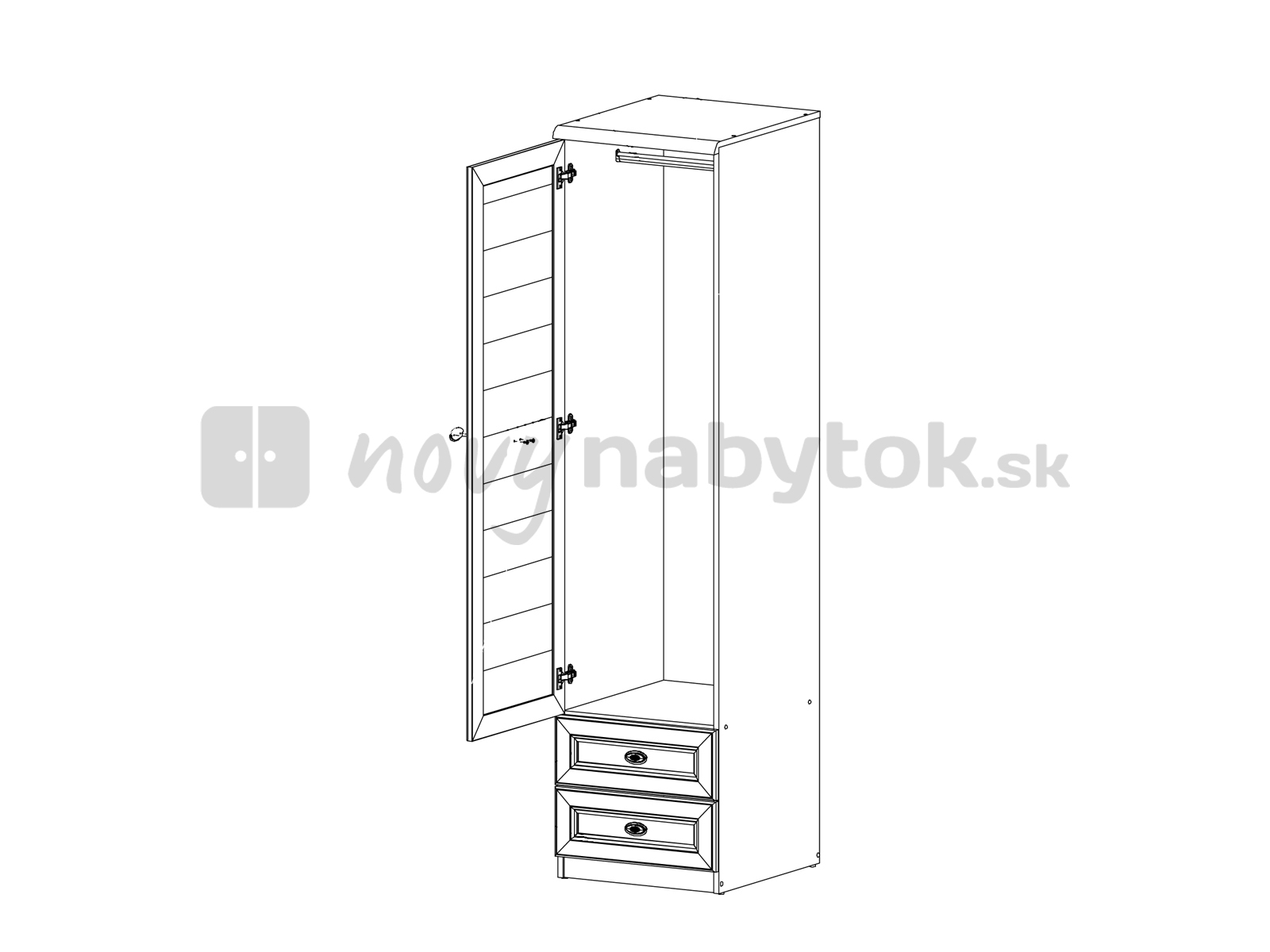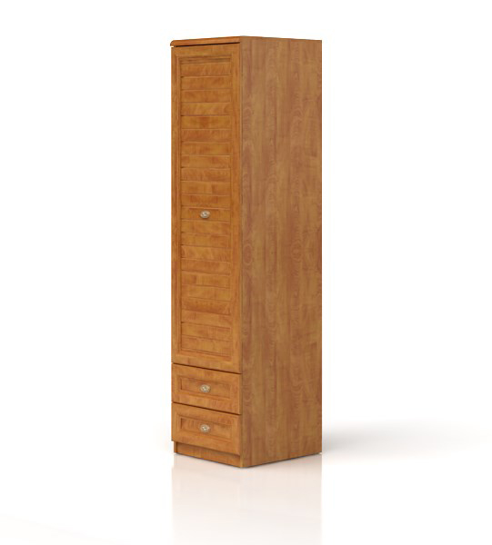 Úzka šatníková skriňa vidieckeho štýlu, ktorou si môžete zariadiť spálne, obývacie izby alebo študentské izby. Budete mať dostatok priestoru pre všetko vaše oblečenie a doplnky. Praktické sú aj dve zásuvky v spodnej časti skrine. Úchyty dvierok a zásuviek sú oválne a kovové. Prírodné farebné prevedenie javor ontário harmonicky dopĺňa rustikálny charakter skrine.