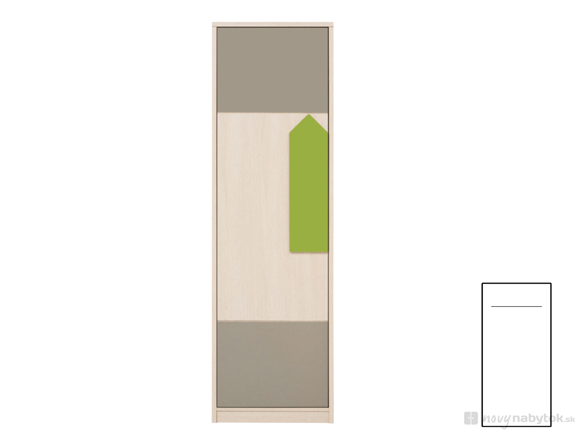 Moderná šatníková skriňa SZF1D_20_6 série Strzalka je veľmi vhodná do detskej izby. Vďaka svojim rozmerom Vám poskytne dostatok úložného priestoru pre Vaše bundy alebo kabáty. Zaujímavé farebné prevedenie dubového dreva a šedej farby v kombinácií so zelenými doplnkami korešpondujú s prevedením celej série. Skriňa je vyrobená z kvalitných materiálov.