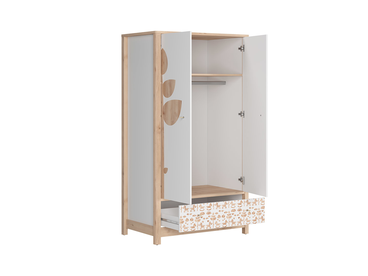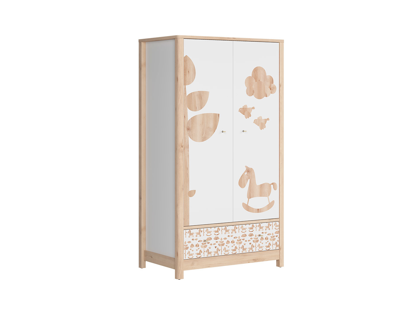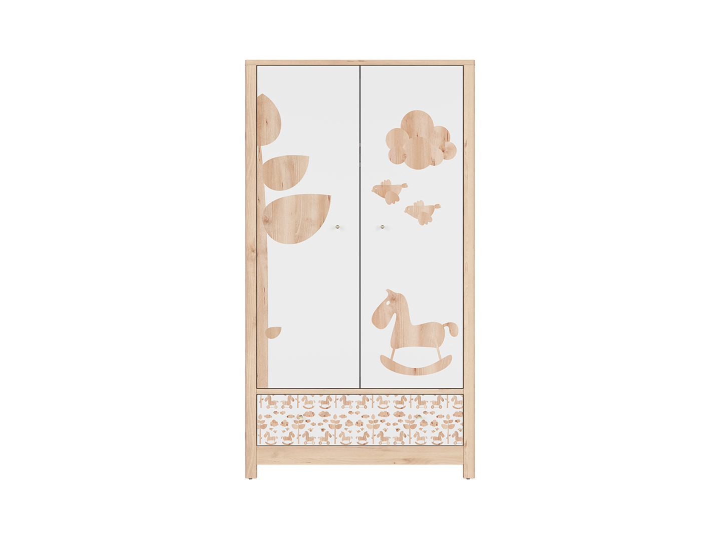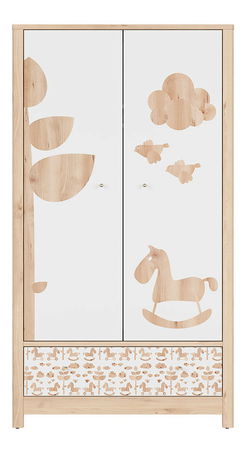 Šatníková skriňa Timon SZF2D1S (buk iconic + biela + koníky) s výškou 182 cm a hĺbkou 60 cm je ideálnym riešením pre Vašu spálňu. Táto skriňa z kolekcie Timon s potlačou koní je nielen krásna, ale aj priestranná. Dvojdverové dvere skrývajú 1 policu a 1 závesnú tyč pre zavesenie oblečenia, zatiaľ čo úložný priestor v spodnej časti ponúka 1 zásuvku. Kožené úchytky zabezpečujú bezpečnú manipuláciu so zásuvkou. Kolekcia Timon kombinuje teplé drevo a bielu farbu, čím vytvára príjemnú atmosféru pre každého člena rodiny. Skriňa je vyrobená z kvalitného dreva a má 1 zásuvku. S touto skriňou bude Vaša spálňa vyzerať skvele a budete mať dostatok miesta na uloženie Vašich vecí.