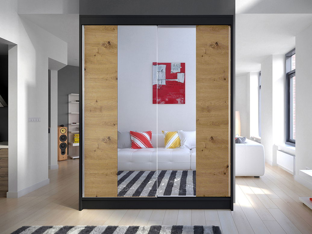 ZobraziťVýrobok Šatníková skriňa - Chantal 2 (čierna + artisan) s výškou 200 cm, šírkou 150 cm a hĺbkou 58 cm je veľmi priestranná a štýlová. Nielenže môžete v nej uložiť svoje oblečenie, ale aj oblečenie ostatných členov rodiny. Napriek svojim veľkým rozmerom sa skriňa nehádže do očí v interiéri, práve naopak, dodáva mu štýlový vzhľad. Posuvné dvere sú pokryté zrkadlovými panelmi, čo opticky zväčšuje miestnosť. Skriňa je vybavená policami rôznych veľkostí, takže môžete správne roztriediť svoje oblečenie. Na pozdĺžnu tyč je možné zavesiť formálne odevy.