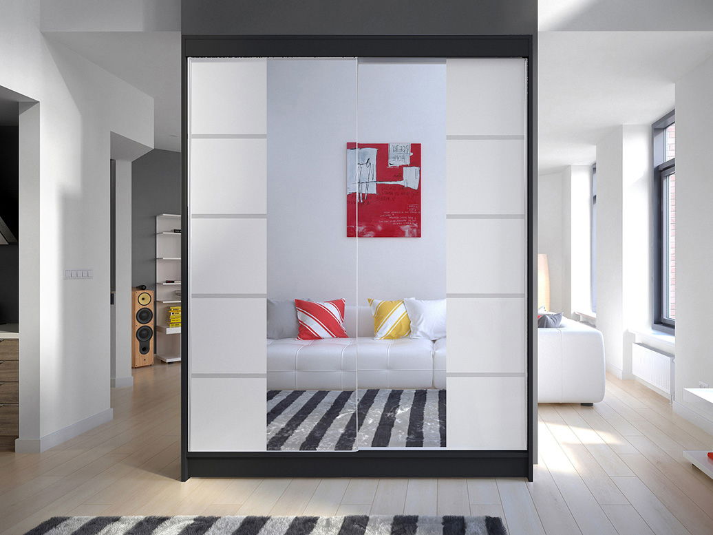 ZobraziťŠatníková skriňa - Chantal 5 (čierna + biela) má výšku 200 cm, šírku 150 cm a hĺbku 58 cm. Táto skriňa ponúka veľa priestoru vo vnútri. Môžete v nej uložiť nielen vlastné oblečenie, ale aj oblečenie ostatných členov vašej rodiny. Napriek svojim veľkým rozmerom je táto šatníková skriňa štýlová a nenápadná v interiéri. _x000D_ _x000D_ Posuvné dvere skrine sú pokryté zrkadlovými panelmi, čo opticky zväčšuje miestnosť. Skriňa je vybavená rôznorodými poličkami, takže môžete správne roztriediť svoje kusy oblečenia. Na pozdĺžnu tyč môžete zavesiť ramienka na formálne príležitosti. _x000D_ _x000D_ Táto šatníková skriňa Chantal 5 je ideálna pre tých, ktorí potrebujú veľa priestoru na oblečenie a chcú mať štýlový a praktický kúsok nábytku vo svojej domácnosti.