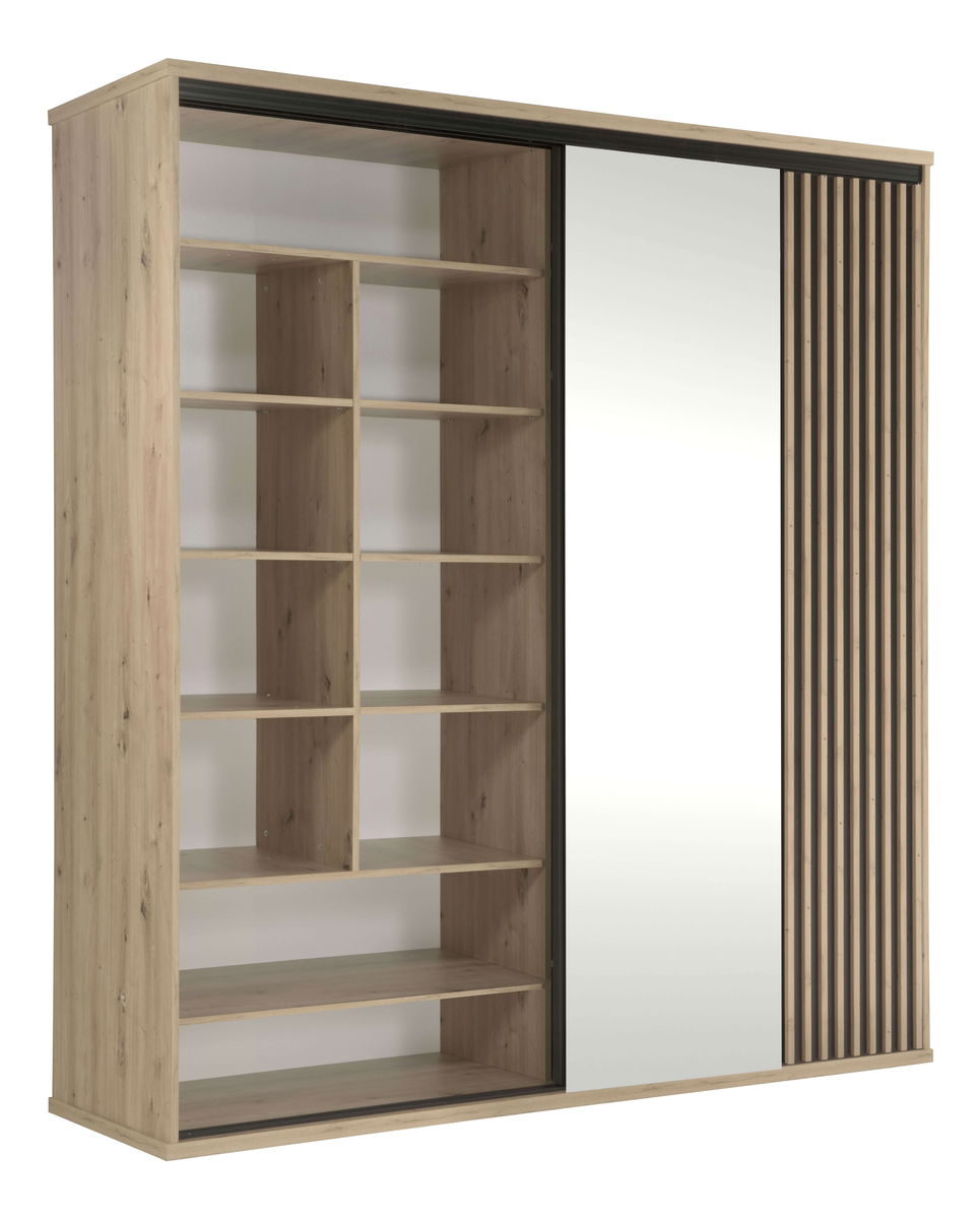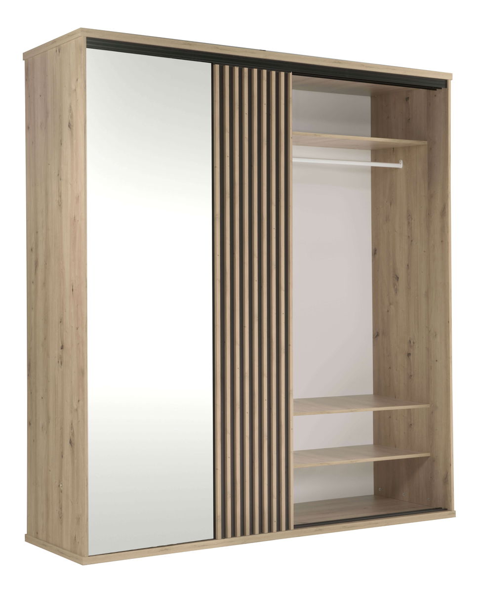 Šatníková skriňa Claudi 15 (dub artisan) s výškou 216 cm, šírkou 199 cm a hĺbkou 60 cm je moderná posuvná skriňa, ktorá ponúka jedinečný a mierne loftový vzhľad spojený s funkčnosťou. Skriňa má harmonické a vyvážené prevedenie, ktoré kombinuje prírodný odtieň Artisan s čiernymi doplnkami a vložkou lamiel. Veľké zrkadlo vpredu opticky zväčšuje priestor a robí skriňu vizuálne atraktívnejšou. Všetky masívy z kolekcie Claudi sú vyrobené z najkvalitnejších materiálov a ponúkajú solídne spracovanie, takže si môžete byť istí, že skriňa bude vydržať dlho a bude plne spĺňať vaše nároky na funkčnosť a dizajn.