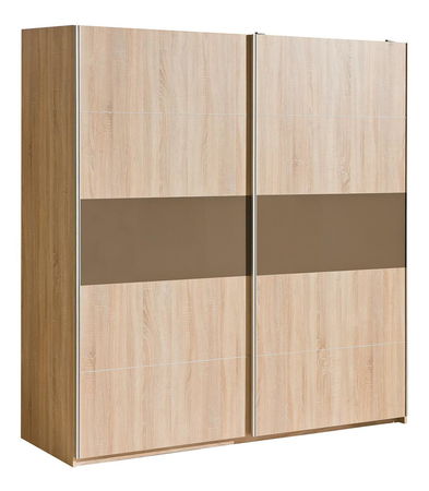 Širšia moderná šatníková skriňa s posuvnými dverami Vám zabezpečí dostatočné množstvo úložného priestoru pre oblečenie, doplnky, športové náčinie a iné drobnosti. Uprostred skrine na frontoch dverí sa nachádza ozdobný pás. V ľavej časti skrine sa nachádza vešiaková tyč a v pravej časti sa nachádzajú police.