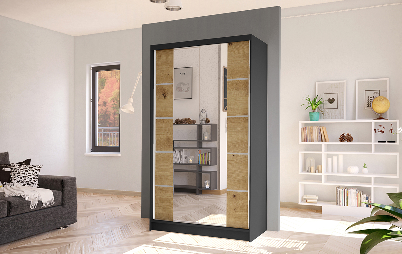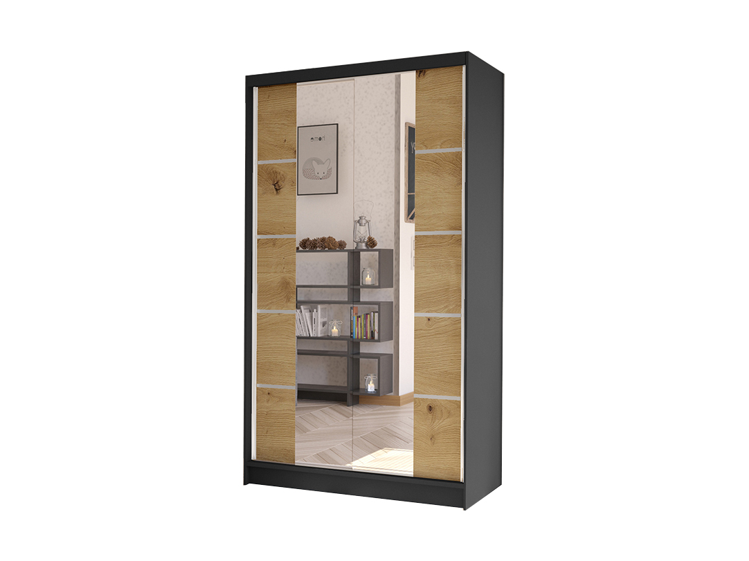 Šatníková skriňa Delana V (čierna + dub artisan) s výškou 200 cm a hĺbkou 58 cm je praktický a štýlový kus nábytku pre vašu spálňu alebo obývačku. Táto skriňa má klasický dizajn v kombinácii čiernej a dub artisan farby. Korpus, deliace priečky a police sú vyrobené z laminovanej dosky (16mm), dvere sú posuvné so systémom hliníkových vodidiel SEVROLL MICRA s doživotnou zárukou. Skriňa má zrkadlo, ABS hrany a lesklé lacobel sklo na prednej strane dverí. Vodidlá sú tiež hliníkové typu Sevroll. Skriňa má 2 posuvné dvere s hliníkovou kľučkou pozdĺž dverí. V balení nájdete všetko potrebné pre svojpomocnú montáž vrátane všetkých prvkov a montážneho návodu. Rozmery balíka č. 1 sú 206x64x9 cm a váži 52 kg, rozmery balíka č. 2 sú 191x66x7 cm a váži 30 kg.