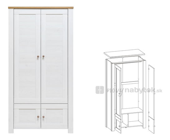 Dominantná dvojdielna šatníková skriňa s vysokými dverami na šatníkovej časti a nízkymi dvierkami na spodku skrine. Zaujímavé drobné okrúhle úchyty na dvierkach v prevedení dub príjemne osviežia svetlé prevedenie.
