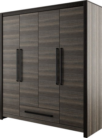 Štvordverová šatníková skriňa s jednou zásuvkou v strede dole. Vo vnútri sa nachádzajú 2 poličky hore a pod nimi a 2 vešiakové tyče, Možnosť dokúpiť poličky v balení po 3 ks pod označením DN19p.