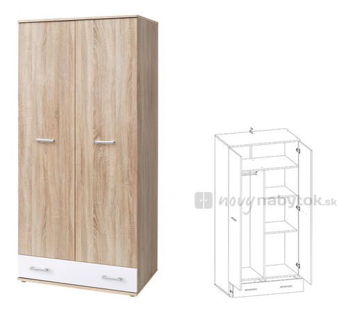 Dvojdverová vešiaková skriňa Emio má moderný dizajn a je veľmi praktická. Je vhodná najmä do detských a študentských izieb a poskytne dostatok potrebného priestoru pre oblečenie, prípadne hračky alebo knihy. Dodáva sa v peknom farebnom prevedení dub sonoma v kombinácii s bielou.