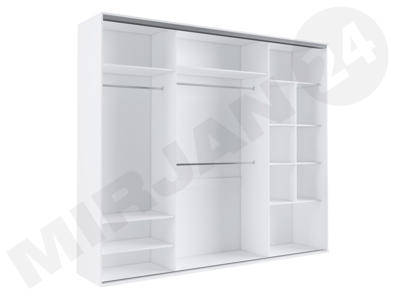 Šatníková skriňa so zrkadlom je vybavená tyčou na vešanie oblečenia a objemnými policami.