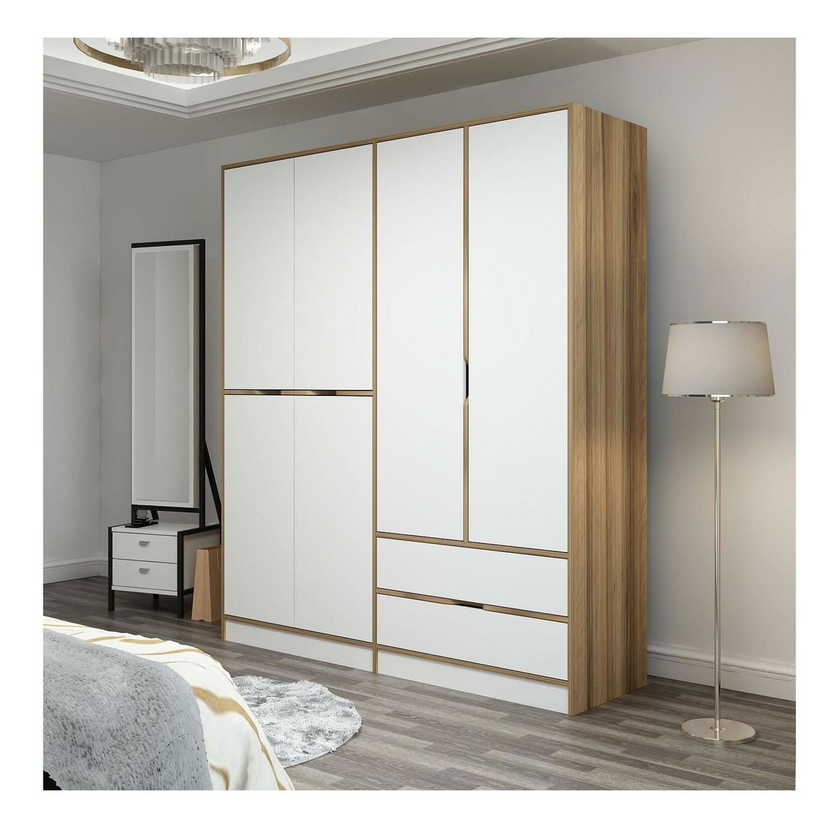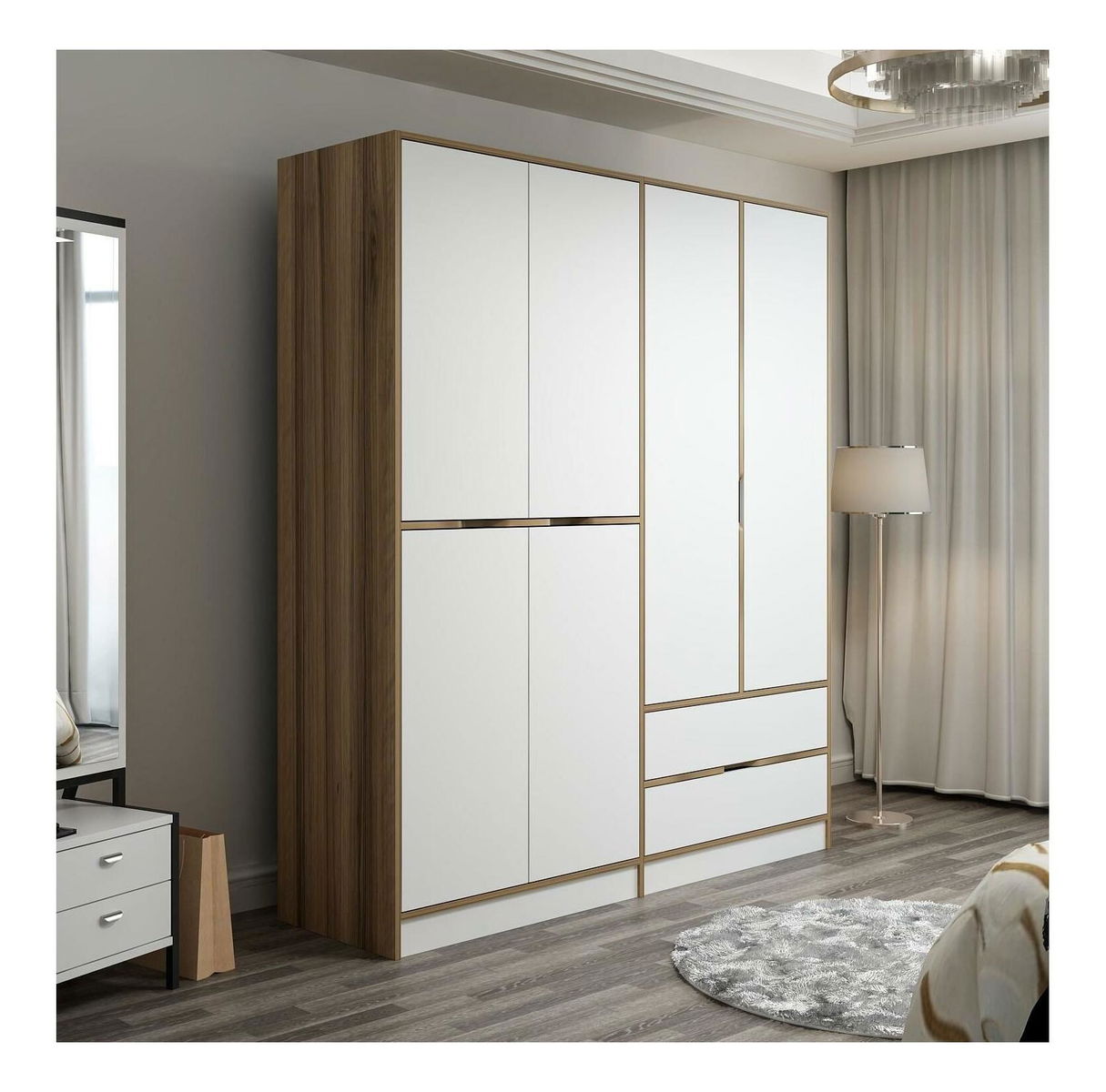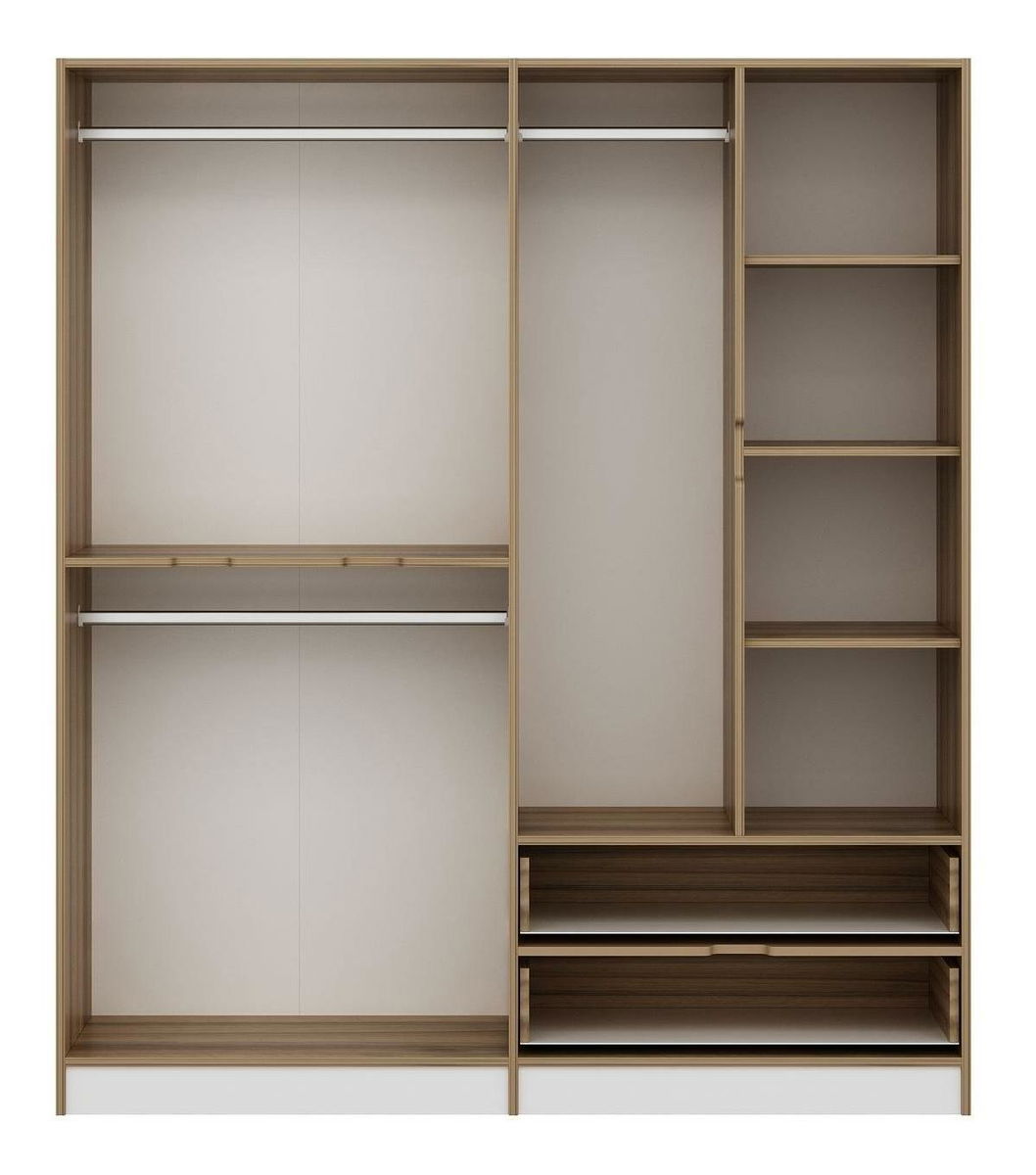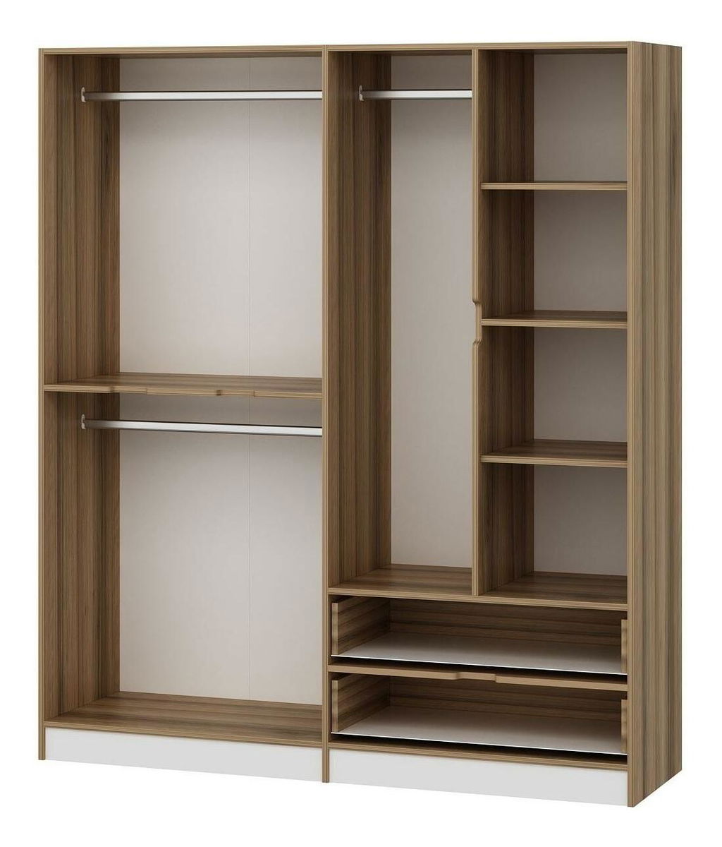 Šatníková skriňa Erich 3 v kombinácii orechového dreva a bieleho povrchu prináša moderný a zároveň nadčasový štýl do vašej spálne alebo predsiene. Vďaka svojmu priestrannému usporiadaniu s viacerými dverami a zásuvkami ponúka dostatok miesta na uloženie oblečenia, obuvi aj doplnkov, čím pomáha udržať poriadok v domácnosti. Skriňa patrí medzi moderné šatníkové skrine, ktoré vynikajú svojou funkčnosťou a dizajnom.