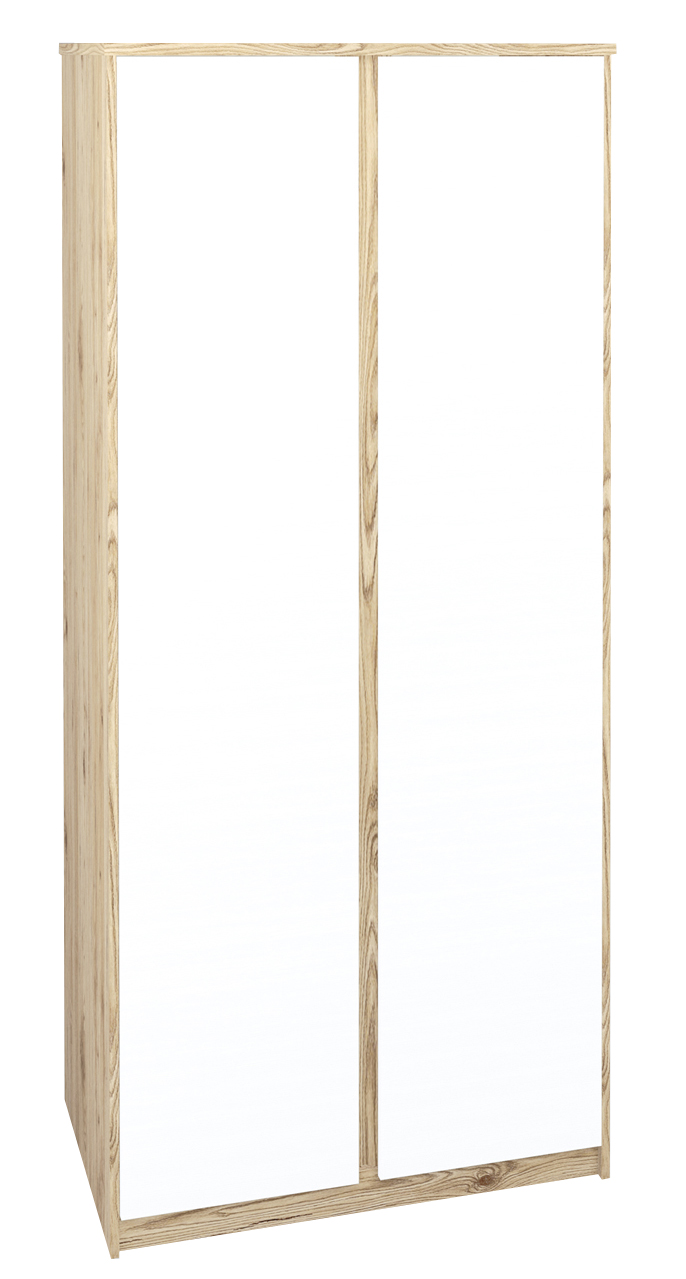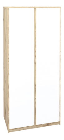 Šatníková skriňa s dvomi dverami, pričom za ľavými sa nachádzajú dve vešiakové tyče a za pravými štyri poličky.