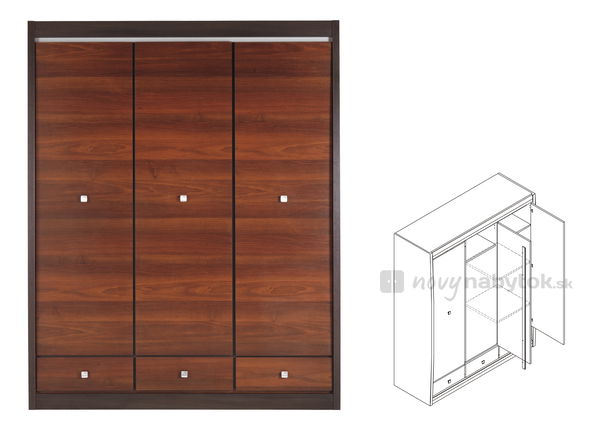ZobraziťŠatníková skriňa Forrest FR/10 v dubovom prevedení s orechom čiernym kombinuje moderný dizajn s praktickými riešeniami pre skladovanie oblečenia. Výška skrine je 200,4 cm a hĺbka 57,5 cm. Skriňa má troje dvere, pričom pravé dvere skrývajú tri poličky a ľavé a stredné dvere vešiakovú tyč s poličkou. V spodnej časti sa nachádzajú tri zásuvky. Všetky tieto prvky spolu tvoria dokonalé miesto na uloženie a organizáciu vašich vecí. Skriňa Forrest FR/10 je súčasťou novej modelovej rady od výrobcu Bog Fran, ktorá prináša kvalitný nábytok s moderným dizajnom pre každý domov.