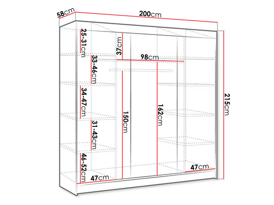 Veľká šatníková skriňa Geneva vo svojom usporiadaní ponúka dva rady priestranných políc, ktoré sú umiestnené na vonkajších stranách. Ústrednou časťou šatníka je však predovšetkým tyč na vešiaky, ktorá uľahčí uloženie vrchného odevu alebo oblečenia so sklonom k pokrčeniu. Systém posuvných dverí sa ľahko pohybuje po hliníkových vodidlách, čo uľahčuje každodenné používanie. Posuvná skriňa je dostupná v módnych farebných variantoch.