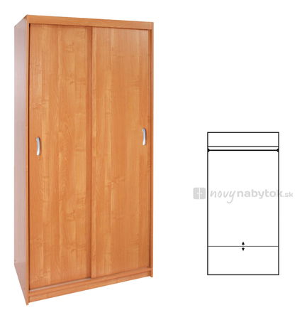Šatníková skriňa s posuvnými dverami. Vo vnútri sa nachádza horná polička, pod ňou sa nachádza vešiaková tyč a na spodku sa nachádza jedna polička. Sivé oválne úchyty, prevedenie jelša a buk.