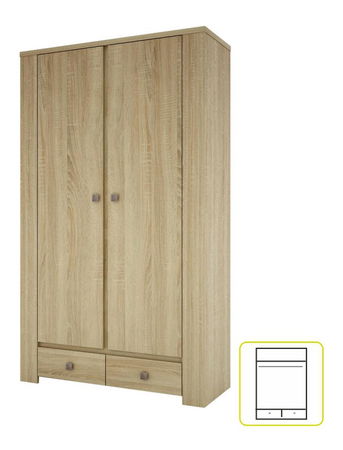 Dvojdverová šatníková skriňa s vešiakovou tyčou umiestnenou pod jednou hornou vnútornou policou. Na spodku sa nachádzajú 2 zásuvky umiestnené vedľa seba.