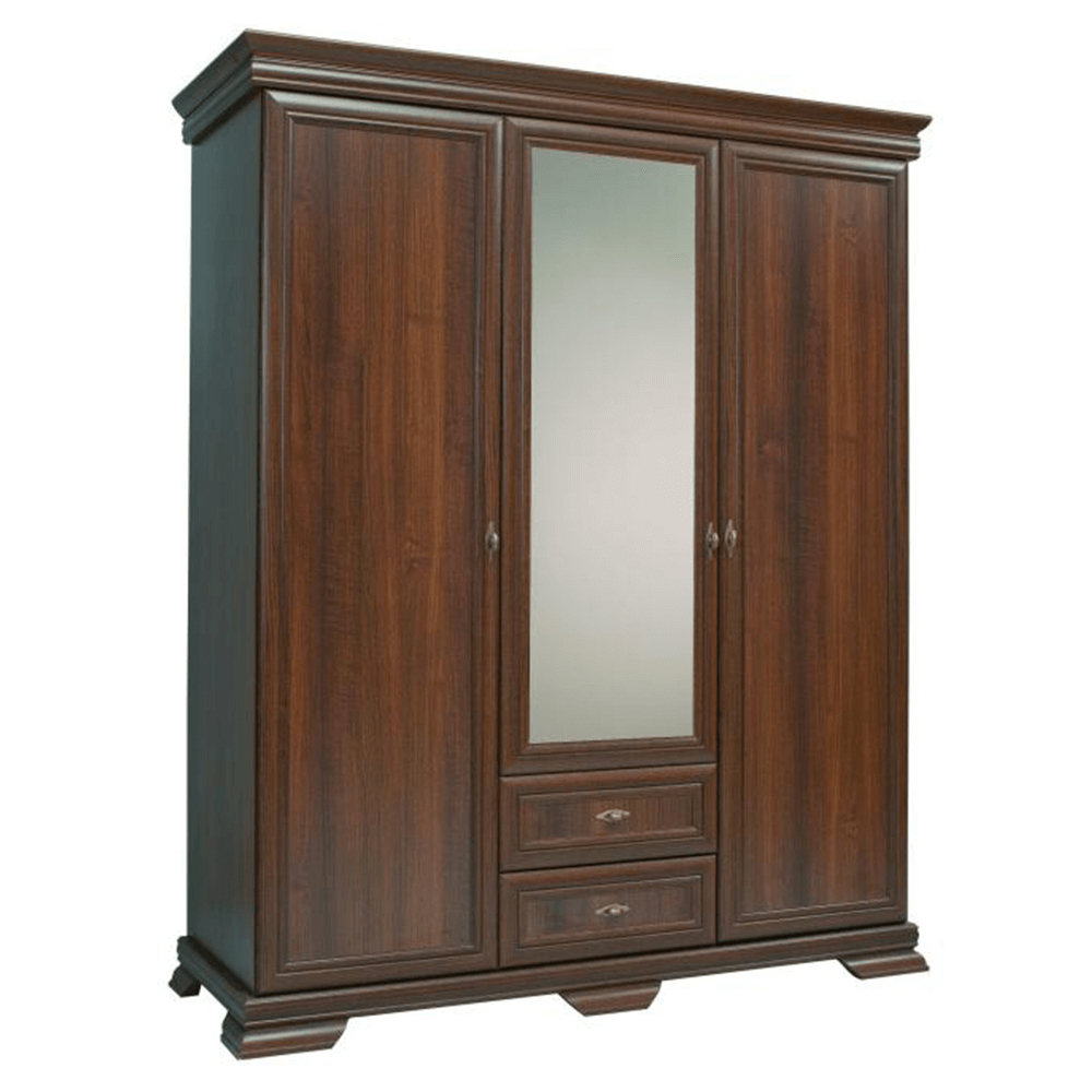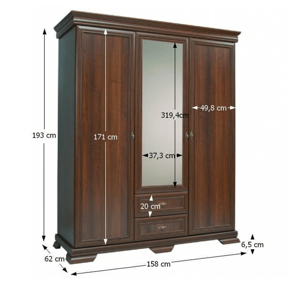 Šatníková skriňa Kraz KS2 s výškou 193 cm a hĺbkou 62 cm vám ponúka veľa miesta na úloženie vašich vecí. Táto skriňa s rustikálnym štýlom má dvere po krajoch, stredná časť má dvierka so zrkadlovou časťou a dve zásuvky. Skriňa má krásne ozdobné nožičky, lišty a kovové úchyty na dvierkach a zásuvkách. Je k dispozícii vo farebnom prevedení Samoa king. Sektorový nábytok Kraz sa vyznačuje masívnym vzhľadom, elegantným tmavým prevedením, ozdobnými lištami a kovovými úchytkami. Široký výber skríň, skriniek, stolíkov a iných prvkov umožňuje zariadiť vašu domácnosť v rustikálnom štýle podľa vašich predstáv. Táto skriňa je vyrobená z laminovanej DTD, MDF, kovu a zrkadla. Jej korpus má hrúbku 15 mm, vrchná a spodná doska majú hrúbku 22 mm a výška spodného priestoru od podlahy je 10,5 cm. Šatníková skriňa Kraz KS2 je elegantným a unikátnym doplnkom do vašej spálne.