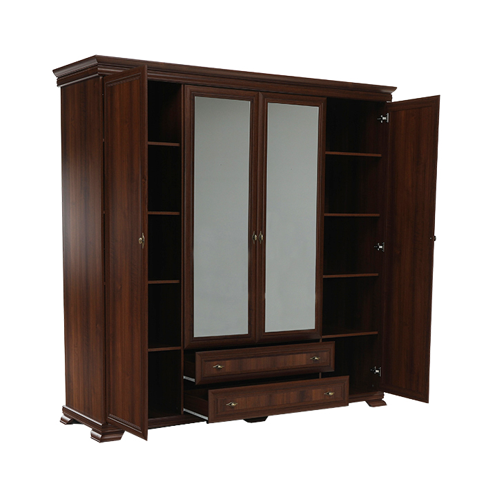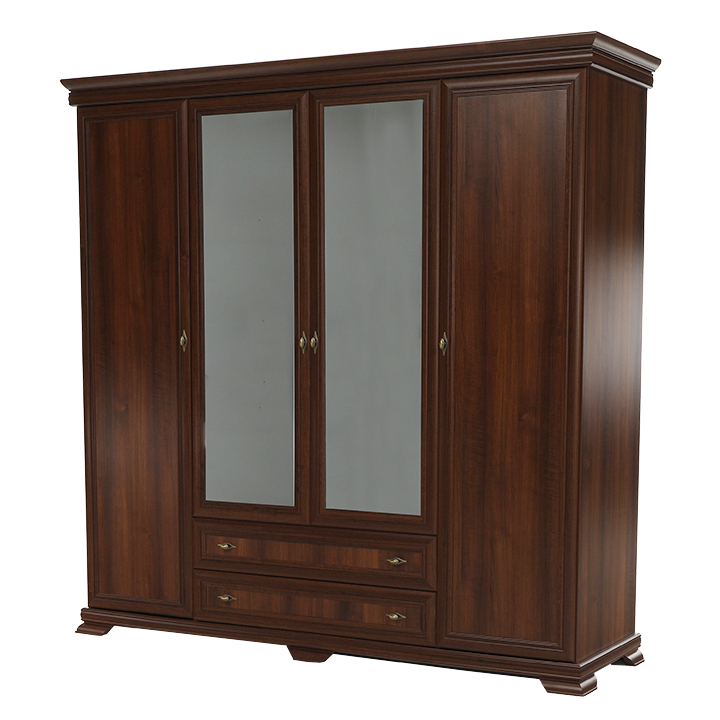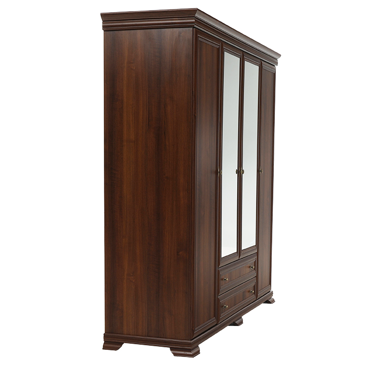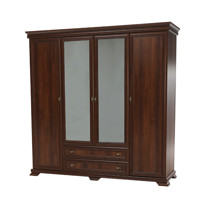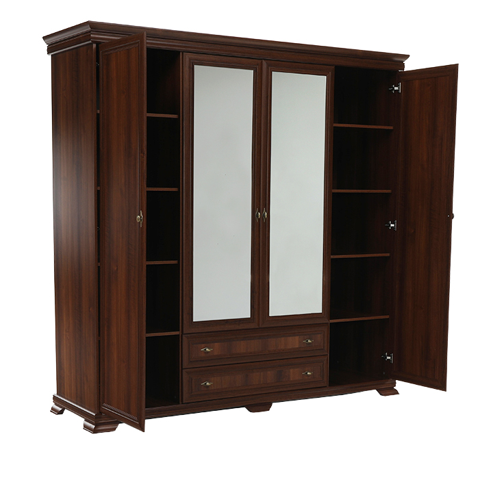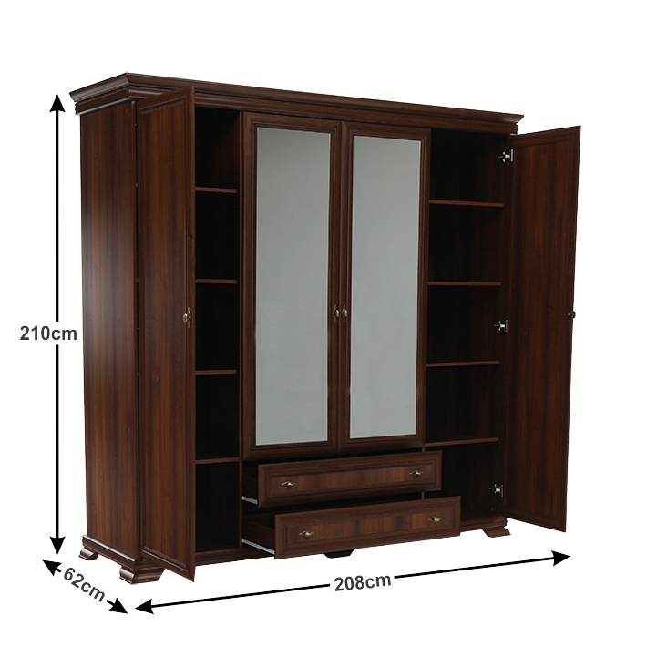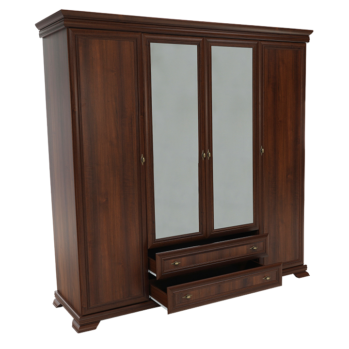 Veľká štvordverová rustikálna skriňa Kora s dvomi dvierkami so zrkadlami uprostred a širokými zásuvkami pod nimi. Bude elegantným kúskom vo vašich spálňach. Je vo farebnom prevedení Samoa king.