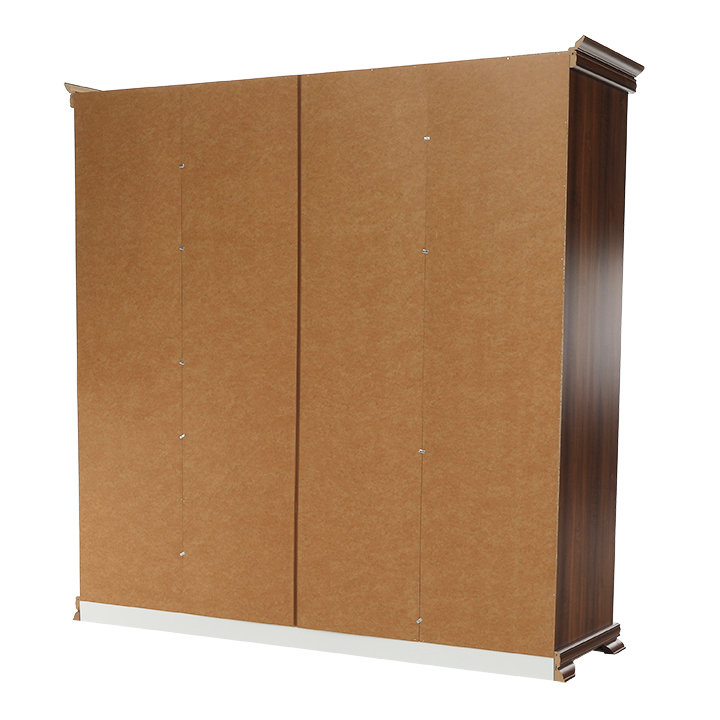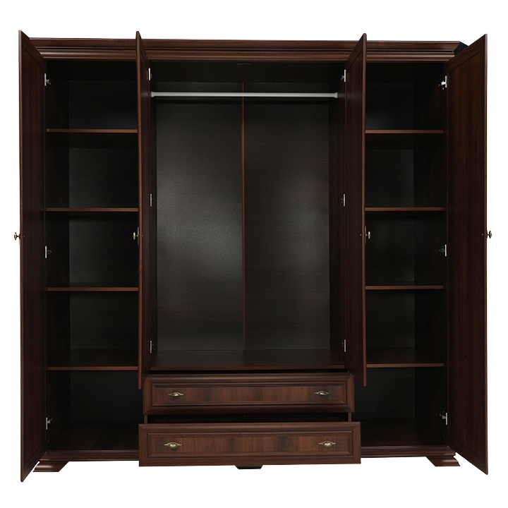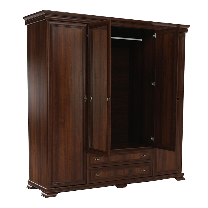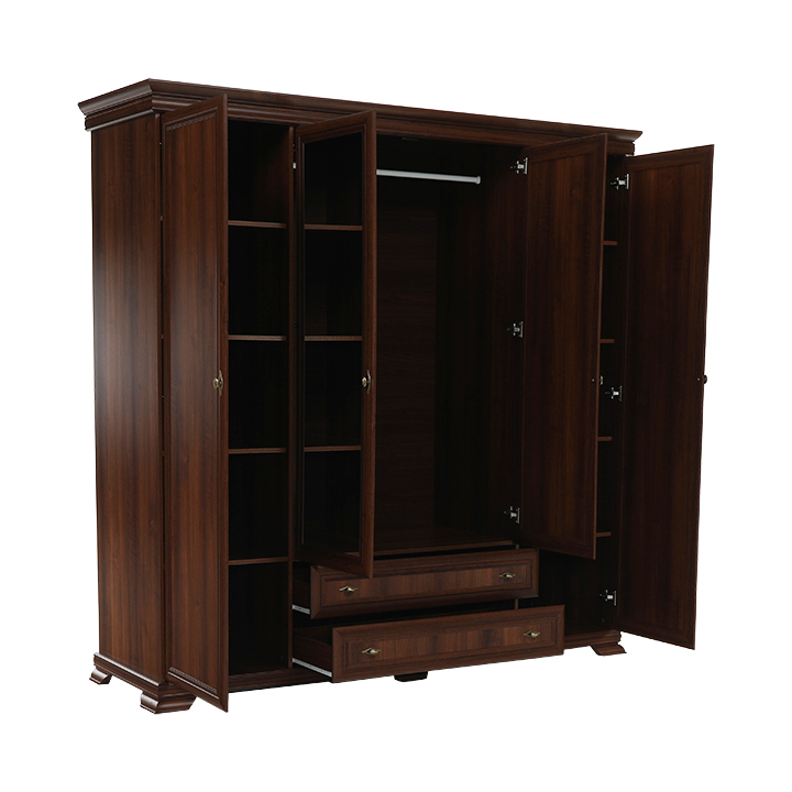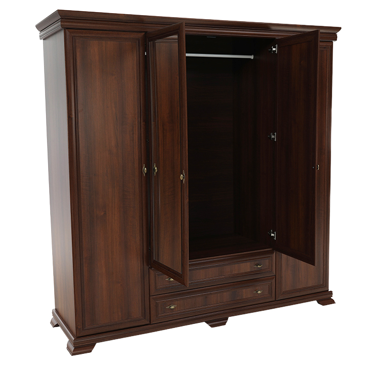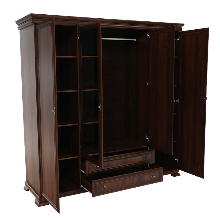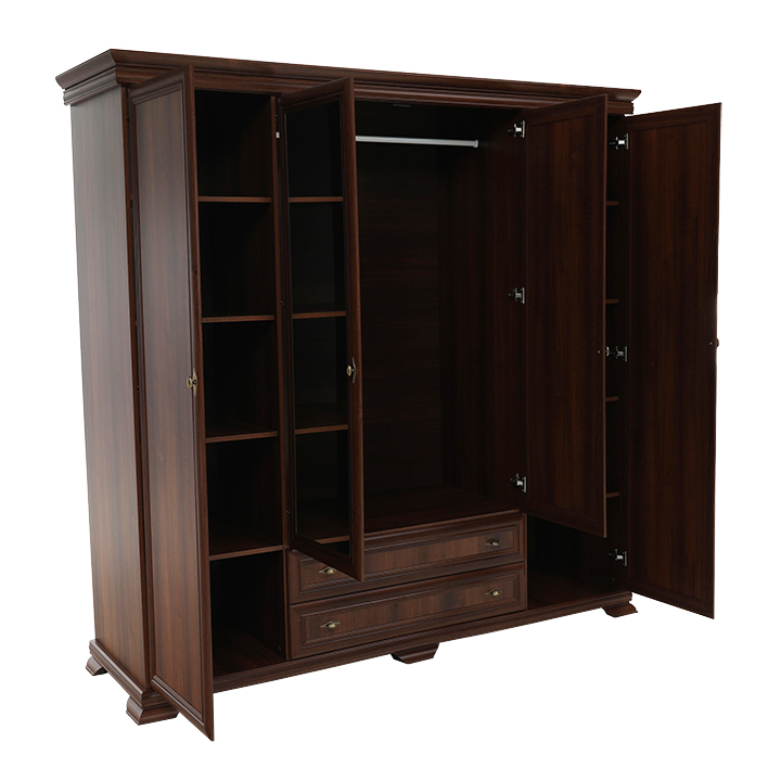 Veľká štvordverová rustikálna skriňa Kora s dvomi dvierkami so zrkadlami uprostred a širokými zásuvkami pod nimi. Bude elegantným kúskom vo vašich spálňach. Je vo farebnom prevedení Samoa king.