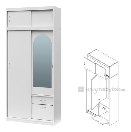 Dvojdverová šatníková skriňa je vhodná ako do predsiene, tak aj spálne. Ponúka množstvo úložného priestoru. V ľavej časti je vešiaková tyč a v časti pravej dvere so zrkadlom, za ktorými sú dve poličky. Pod nimi je ešte zásuvka a skrinka. Úložný priestor ešte žväčšuje malá skrinka na vrchu skrine.
