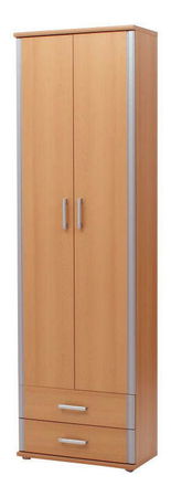 Dvojdverová šatníková skriňa s vešiakovou časťou a dvomi zásuvkami v dolnej časti.