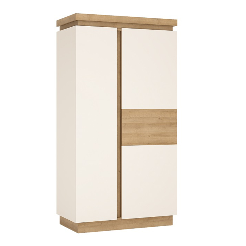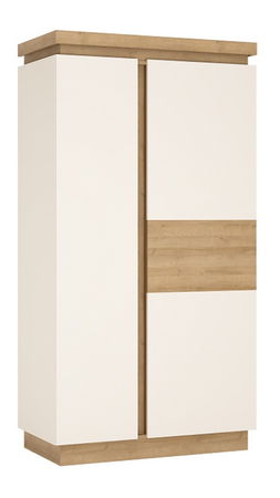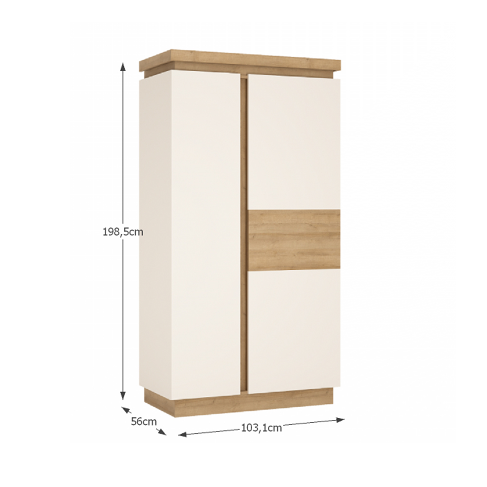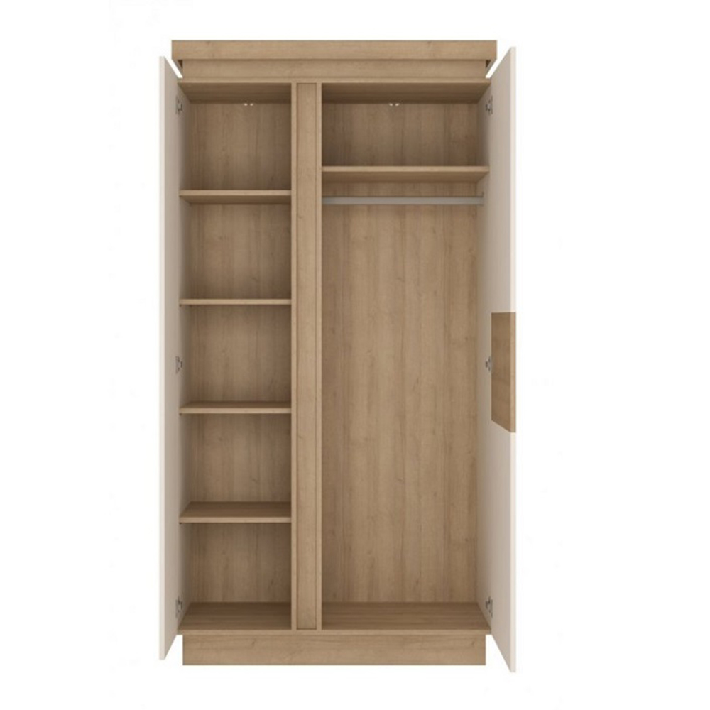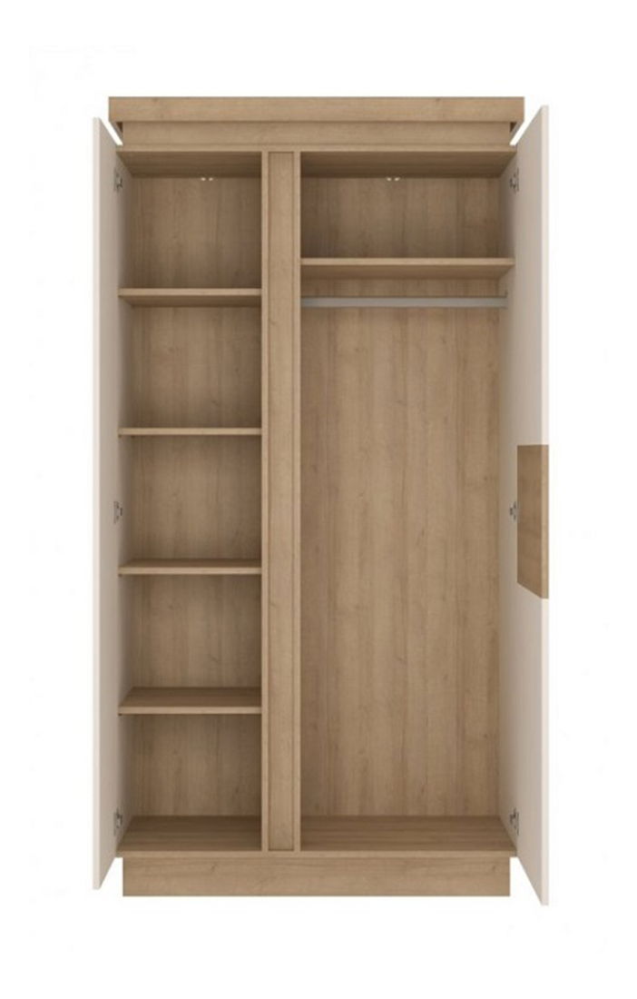 Šatníková skriňa Leonan v dub riviera farbe a s extra vysokým leskom bielym vyzerá moderné a veľmi atraktívne. Okrem svojho vizuálneho dizajnu, ponúka aj veľké množstvo úložného priestoru pre Vašu odevnú kolekciu. Vľavo sa nachádzajú policové priestory a vpravo horný priestor na odkladanie a vešiaková tyč na zavesenie oblečenia. Táto skriňa je vyrobená z laminovanej DTD, s hrúbkou materiálu 16 mm a systémom tichého uzatvárania dvierok. LED osvetlenie po celej skriňe je zahrnuté v cene. Skriňa je dodávaná v demonte a jej rozmery sú 103,1 cm x 56 cm x 198,5 cm (ŠxHxV).
