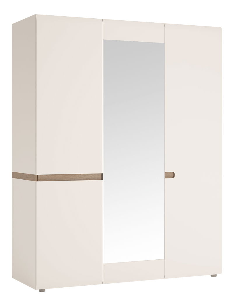 Šatníková skriňa Lysander Typ 22 3D výška 209 cm hĺbka 59 cm Biela + Dub Sonoma truflový je luxusný nábytok, ktorý sa skvele hodí do vašej spálne alebo šatne. Skriňa má 3 dvere, z ktorých dve sú bielo-lamelové a jedno dvere je zrkadlové. Vnútri sa nachádzajú 2 vešiakové tyče a piatimi policami, ktoré vám umožnia uložiť a organizovať vaše veci. Skriňa je vyrobená z laminovanej DTD, ktorá chráni nábytok pred poškriabaním, vlhkosťou a vysokou teplotou. Predné strany sú vyrobené z MDF s extra vysokým leskom HG a majú moderné zaoblené hrany. Skriňa je v kombinácii s farbou dub sonoma truflový, čo dodáva nábytku moderný a elegantný vzhľad. Skriňa sa dodáva v demonte a je vybavená LED osvetlením, ktoré sa dokúpi, aby ste mali dokonalý prehľad o vašich veciach. Celkové rozmery skrine sú 164x59x209 cm.