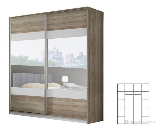Rozmerná vešiaková skriňa s dvomi posuvnými dverami. Materiálom je laminovaná DTD. Prevedenie je dub sonoma trufel (korpusa a dvierka), sivá farba (dvierka) a zrkadlo (dvierka). Vo vnútri nájdete v strede 2 vešiakové tyče s hornými policami a po stranách sa nachádzajú police.