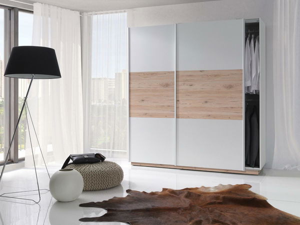Lámete si hlavu kam so všetkým Vašim oblečením? Uložte ho do tejto priestrannej šatníkovej skrine s posuvnými dverami! Za dverami sa nachádzajú police v ľavej časti a dve vešiakové tyče v pravej časti. Moderný dizajn skrine doplňuje estetický pás uprostred na dverách. Skriňa sa hodí najmä do priestrannejších interiérov.