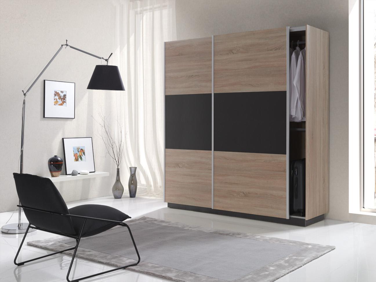 Lámete si hlavu kam so všetkým Vašim oblečením? Uložte ho do tejto priestrannej šatníkovej skrine s posuvnými dverami! Za dverami sa nachádzajú police v ľavej časti a dve vešiakové tyče v pravej časti. Moderný dizajn skrine doplňuje estetický pás uprostred na dverách. Skriňa sa hodí najmä do priestrannejších interiérov.