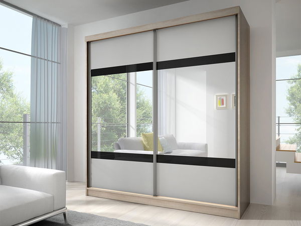 Šatníková skriňa Mebur 02 230 (dub sonoma + biela + zrkadlo + čierne sklo)
