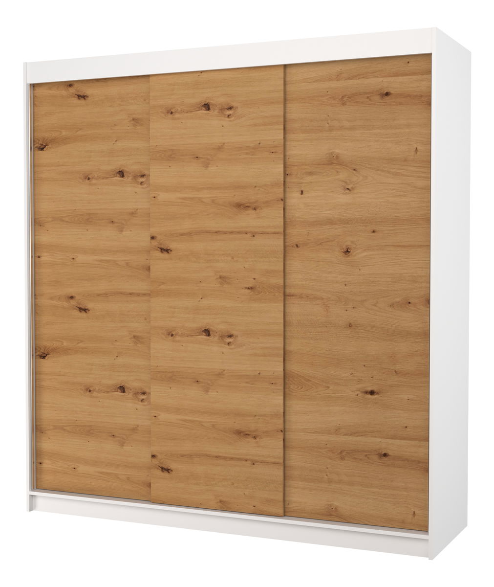 ZobraziťŠatníková skriňa Meggie v bielom prevedení s drevom dub artisan je skvelým doplnkom vašej spálne. S výškou 215 cm a šírkou 200 cm ponúka dostatok úložného priestoru pre vašu odevnú kolekciu. Skriňa disponuje množstvom policových plôch, závesných tyčí a vysúvacích zásuviek, ktoré vám uľahčia organizáciu vašich vecí. Jedinečný dizajn kombinuje bielu farbu so vzorom drevovýzoru, čo dáva skrini unikátny vzhľad. Je vyrobená z kvalitných materiálov, čo zaručuje jej dlhú životnosť a odolnosť voči poškodeniu. Vďaka svojim rozmerným vlastnostiam je ideálna pre väčšie spálne a jej moderný vzhľad prinesie novú atmosféru do vášho interiéru.