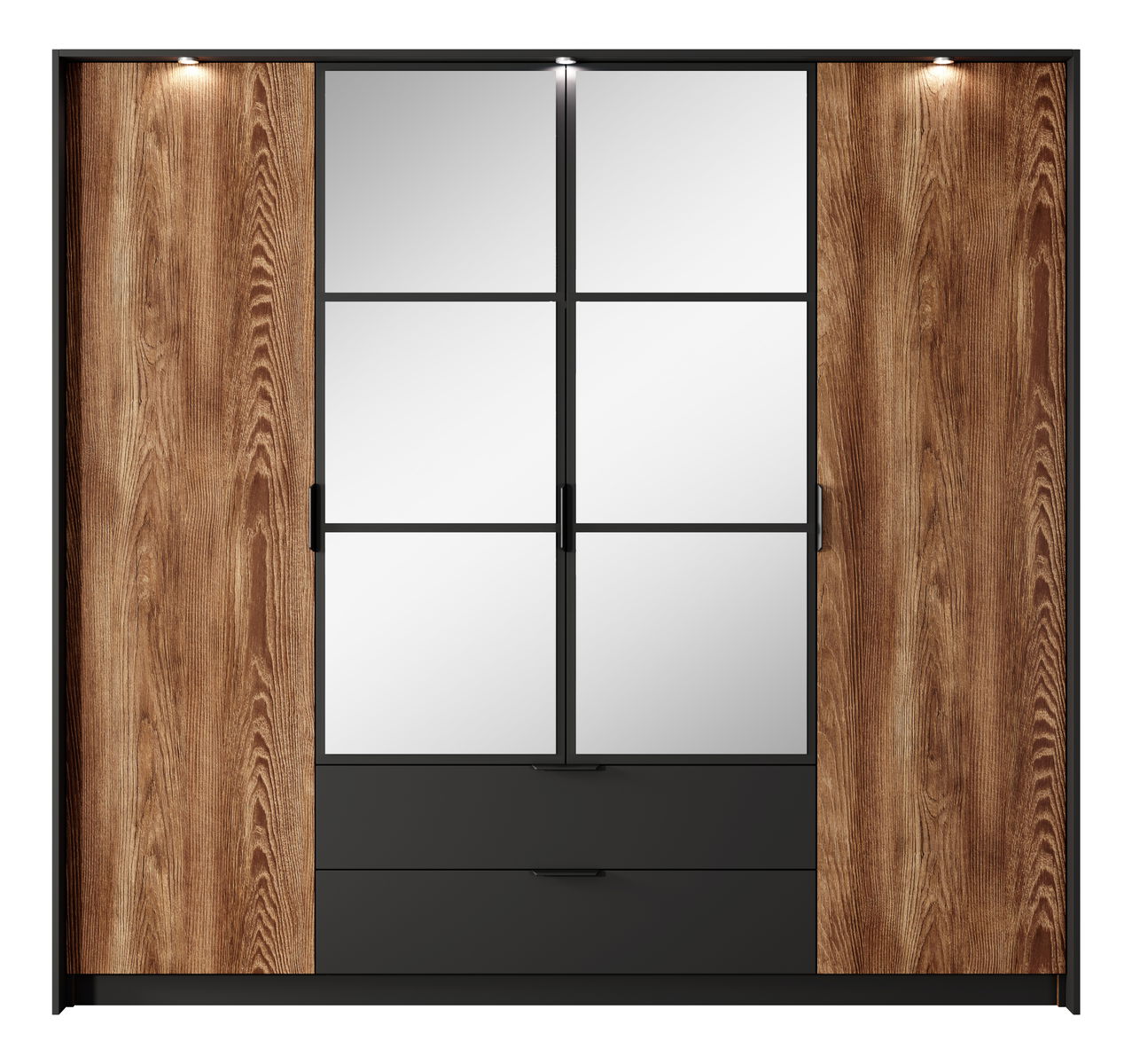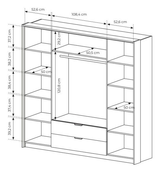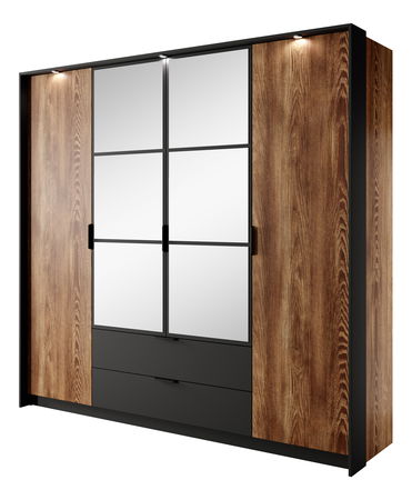 ZobraziťTáto moderná šatníková skriňa ponúka dokonalú kombináciu funkčnosti a elegantného dizajnu. Korpus aj predné plochy sú vyrobené z laminovanej drevotriesky E05, pričom čelná časť je doplnená o kvalitnú MDF dosku pre vyššiu pevnosť a atraktívny vzhľad. Zadná doska v dekore dub craft zlatý prináša teplý prírodný akcent. Skriňa disponuje štyrmi dvierkami, z ktorých časť je doplnená zrkadlom, čo opticky zväčší priestor a zároveň zvýši praktickosť pri každodennom používaní. Vnútorné usporiadanie ponúka dostatok priestoru vďaka deviatim policiam a jednej vešiakovej tyči. Dve priestranné zásuvky na guľôčkových ložiskách s plným výsuvom umožňujú pohodlné uskladnenie bielizne či doplnkov. Čierne kovové úchytky dodávajú nábytku moderný charakter, zatiaľ čo pánty s tichým zatváraním zabezpečujú komfort pri manipulácii s dvierkami. Pre ešte atraktívnejší vzhľad je možné skriňu doplniť o LED osvetlenie za príplatok. Táto šatníková skriňa je ideálnou voľbou pre každého, kto hľadá spojenie štýlu, kvality a praktického riešenia úložného priestoru.