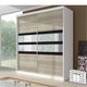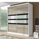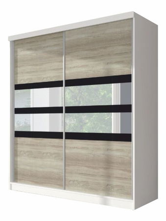 Rozmerná vešiaková skriňa s dvomi posuvnými dverami. Materiálom je laminovaná DTD. Prevedenie je biela farba (korpus), dub sonoma (dvierka) a čierne sklo so zrkadlom. Vo vnútri nájdete v strede 2 vešiakové tyče a hornú policu a po stranách sa nachádzajú police.