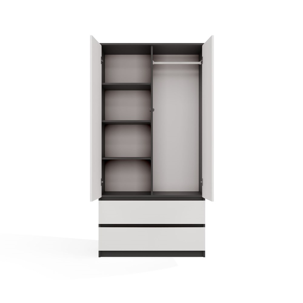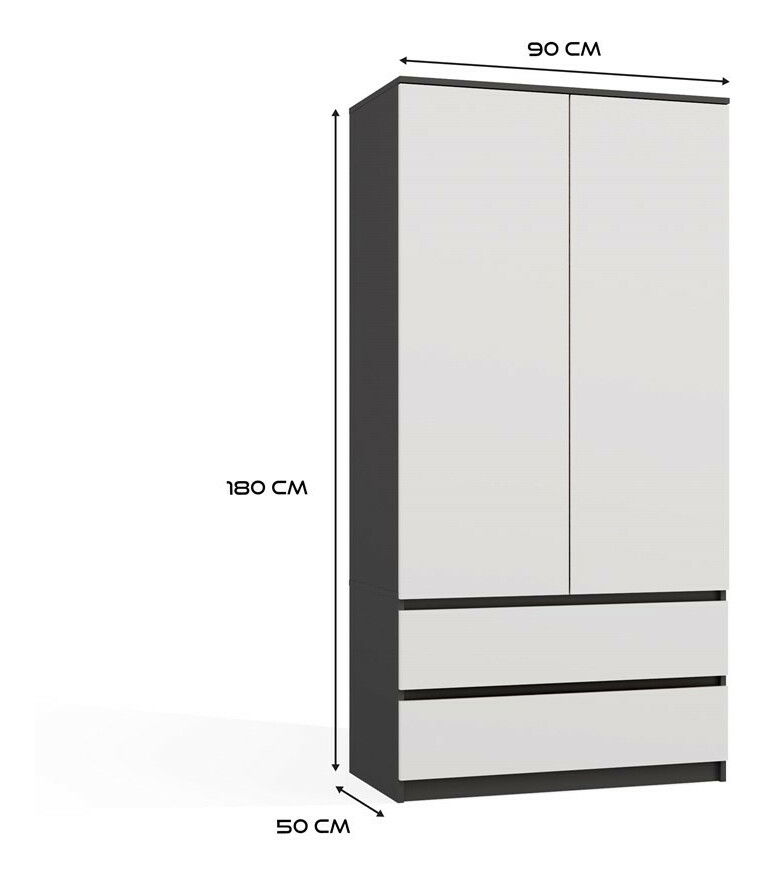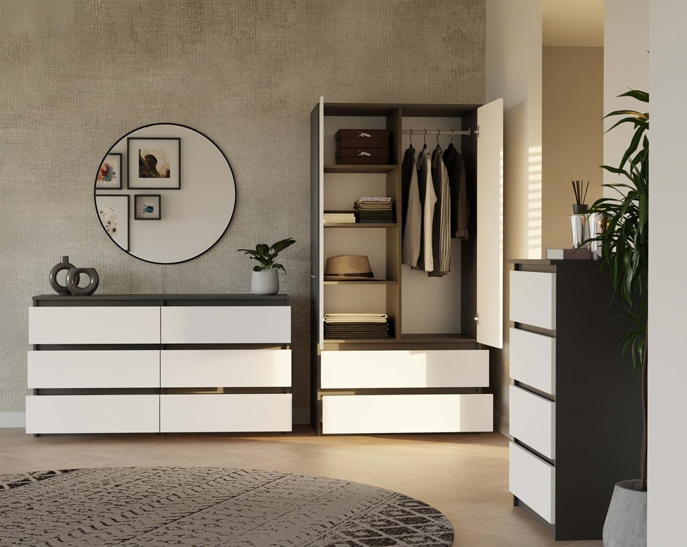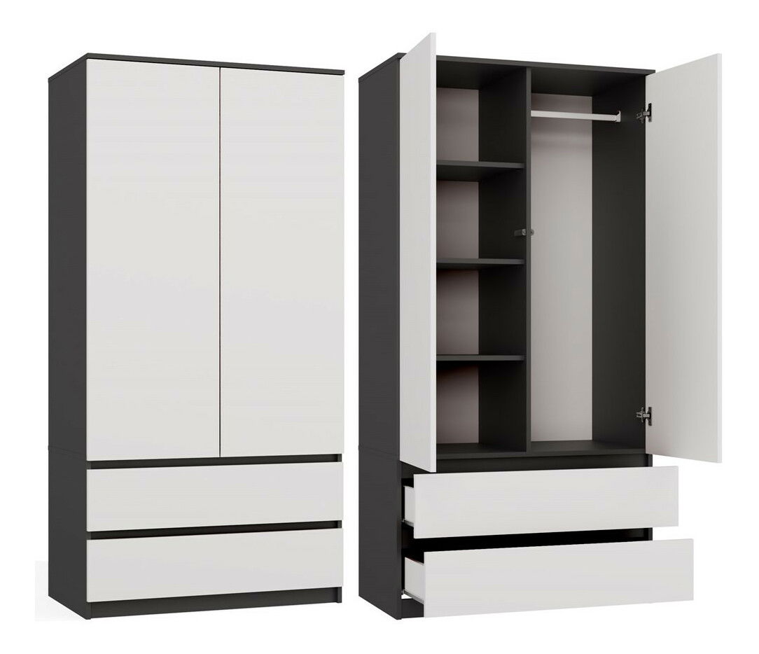 Šatníková skriňa Musecalo 1 v elegantnej kombinácii antracitovej a bielej farby je ideálnym riešením pre moderné interiéry, či už v spálni, alebo v kancelárii. Tento praktický nábytok ponúka dostatok úložného priestoru pre oblečenie a dokumenty, pričom jeho robustná konštrukcia z kvalitnej laminovanej drevotriesky zaručuje odolnosť voči znečisteniu a vlhkosti. Inovatívny systém TIP-ON umožňuje jednoduché otváranie dverí bez úchytiek, čo zvyšuje estetiku a pohodlie pri používaní. Musecalo 1 je skvelou voľbou pre tých, ktorí hľadajú funkčný a štýlový nábytok.