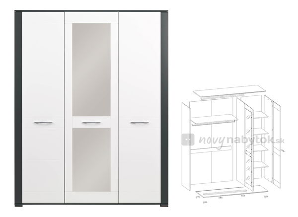 Elegantná trojdielna šatníková skrina s dvierkami. Na stredných dvierkach sa zvonku nachádza úzke zrkadlo.