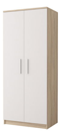 Šatníková skriňa - Oleg III (biela + dub sonoma) je minimalistická šatníková skriňa vyrobená z 16 mm hrubej drevotriesky. Vnútorné aj vonkajšie časti skrine sú vyrobené z tejto kvalitnej drevotriesky a sú doplnené o 0,5 mm ABS hranami, ktoré zaručujú vyššiu odolnosť a lepší vzhľad. Skriňa je vybavená praktickými striebornými plastovými úchytmi, ktoré zároveň podporujú jej minimalistický dizajn. Bez nožičiek poskytuje stabilnú oporu priamo na podlahe. S dvoma dverami ponúka dostatočný úložný priestor. Vnútri skrine sa nachádzajú štyri poličky a vešiaková tyč, vďaka čomu je možné efektívne usporiadať oblečenie a iné predmety. Tento kus nábytku je ideálny pre tých, ktorí hľadajú jednoduchosť a funkčnosť v ich domovoch.