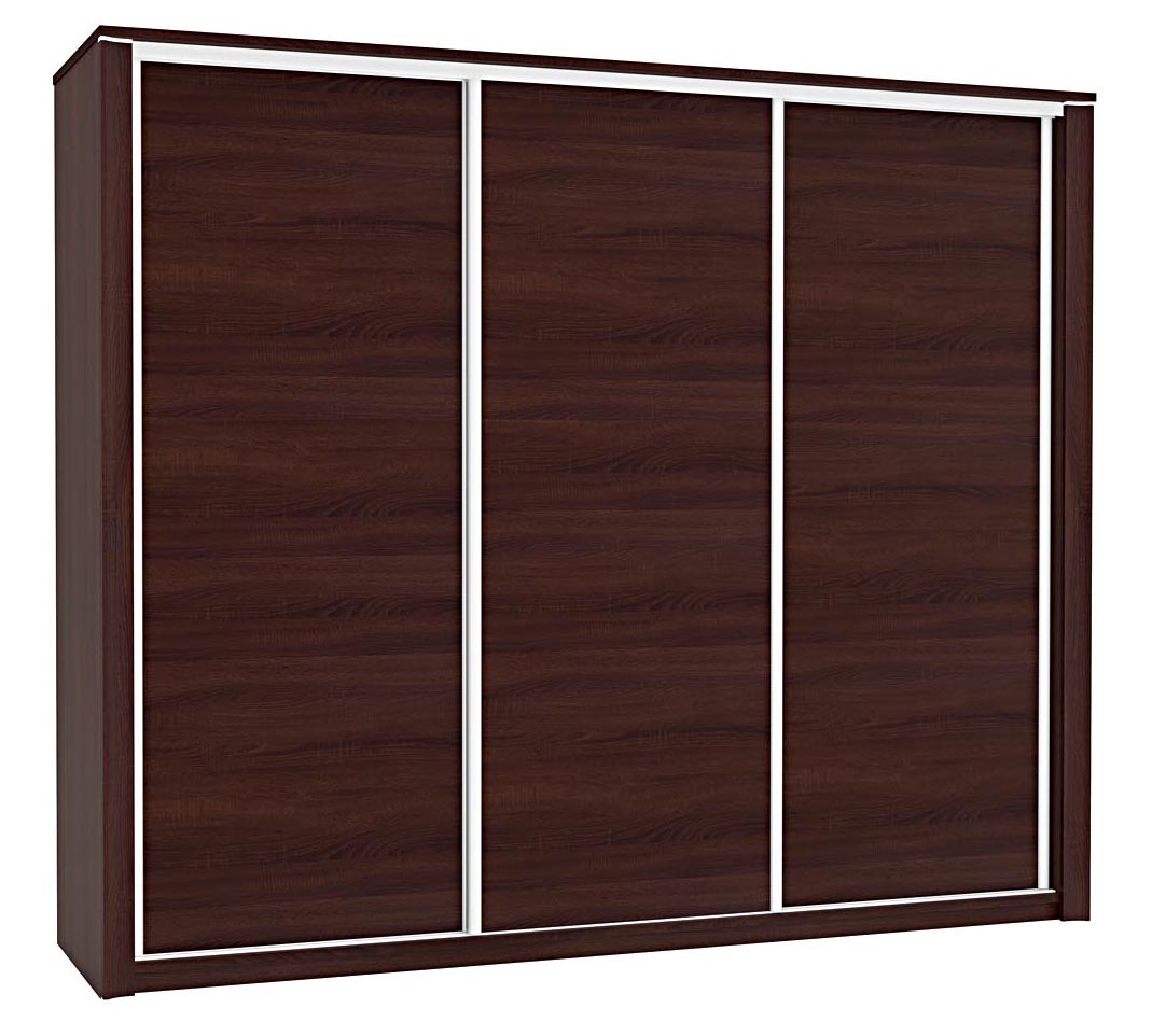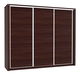 Trojdielna šatníková skriňa s posuvnými dverami. V ľavej časti sú umiestnené dve vešiakové tyče (hore a v strede), uprostred sa nachádzajú 4 poličky, vpravo je v hornej časti polička, pod ktorou je umiestnená vešiaková tyč.