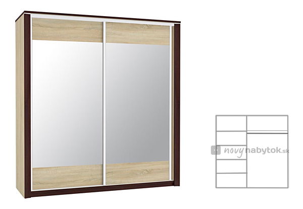 Dvojdielna šatníková skriňa s posuvnými dverami. V ľavej časti sa nachádzajú 4 polička a v časti pravej polička, pod ktorou je umiestnená vešiaková tyč. Na oboch dverách je umiestnené zrkadlo.