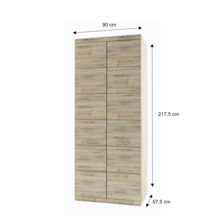 Šatníková skriňa Oscroft 2D v dubovom prevedení s výškou 217,5 cm a hĺbkou 57,5 cm je ideálnou voľbou pre úložbu dlhších kúskov oblečenia nielen do šatníka, ale aj do predsiene. Skriňa je vyrobená z DTD laminovaného materiálu s ABS hranami, čo zaručuje pevnosť a odolnosť. Súčasťou skrine je výklopná polička a vešiak na oblečenie. Rozmery skrine sú 90 x 57,6 x 217,3 cm a hrúbka materiálu dosahuje 16 mm. Skriňa sa dodáva v demonte a je jednoduchá na zostavenie. Táto vešiaková skriňa vám pomôže udržať vašu izbu čistú a dobre zorganizovanú.