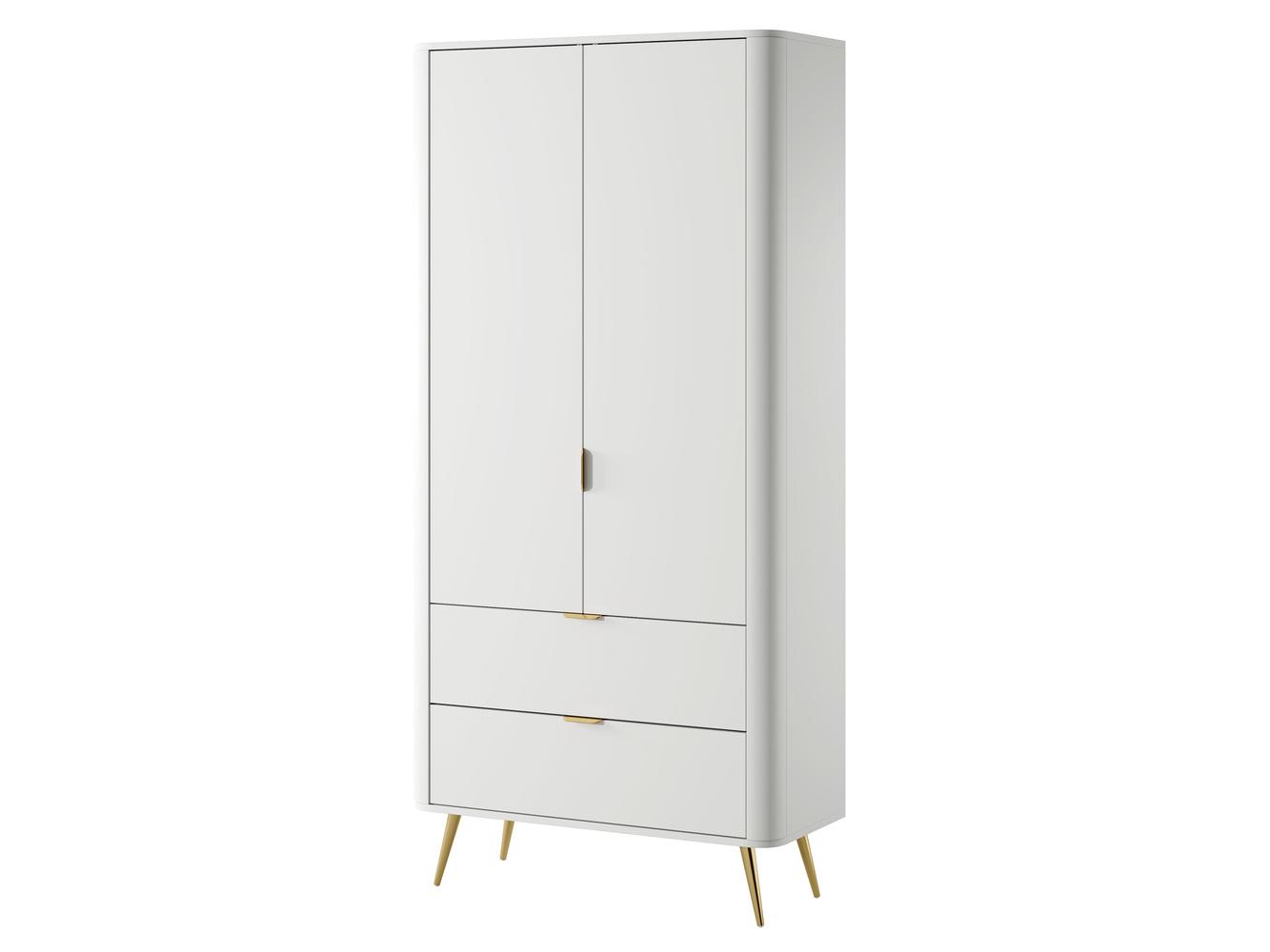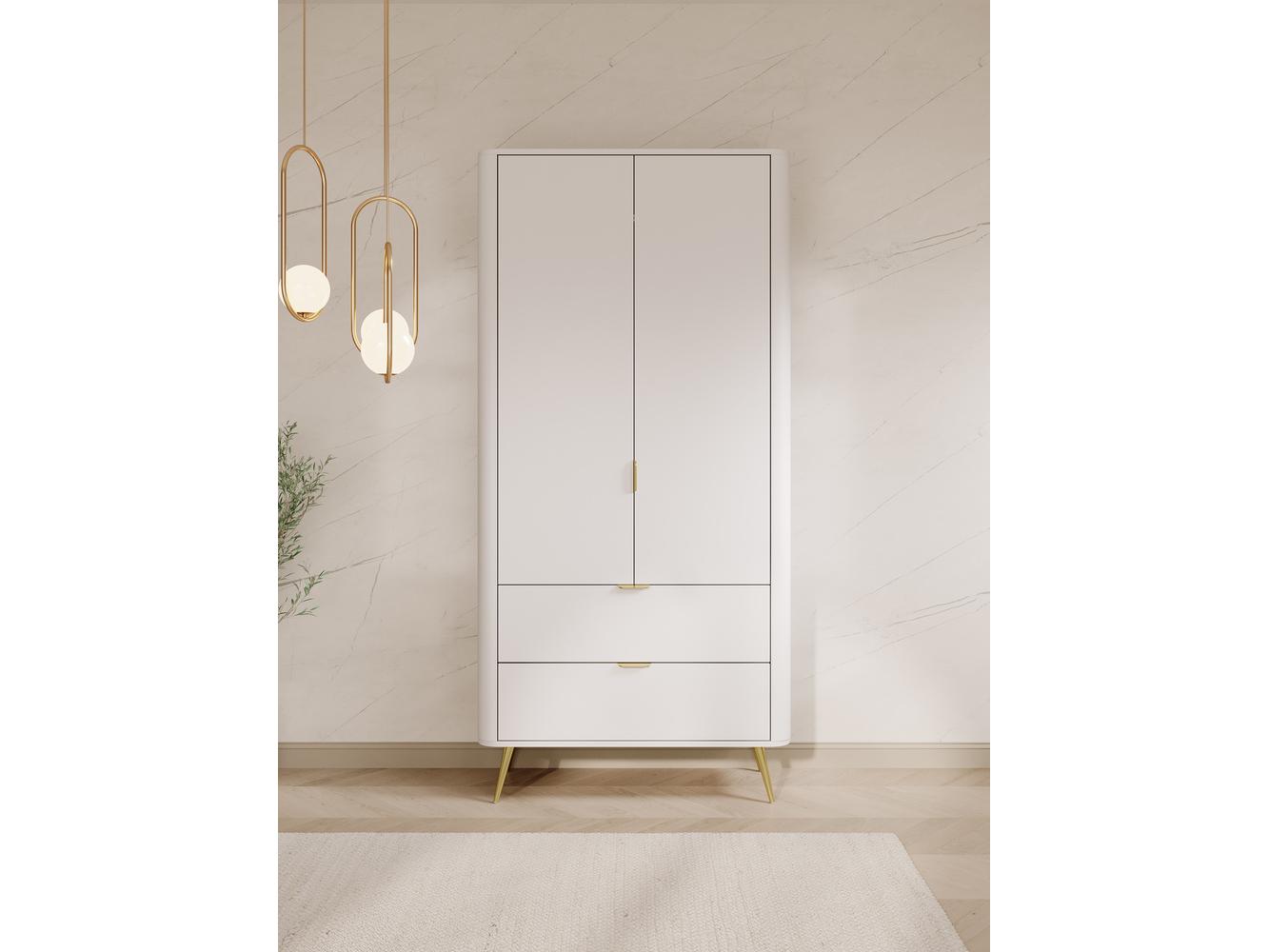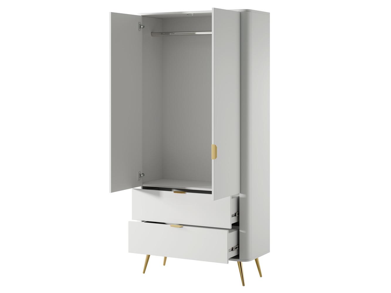 Nudia vás klasické tvary nábytku? Chcete zmeniť svoj byt? Vyberte si kolekciu a prekvapte všetkých svojich hostí Skriňa je moderným kusom nábytku, ktorý prekvapí svojim tvarom, dodávajú eleganciu a sú vhodné pre deti. Skriňa má dve priestranné zásuvky, do ktorých sa zmestia všetky drobnosti oblečenia alebo náhradné súpravy posteľnej bielizne či uterákov, a veľký výklenok s tyčou na zavesenie oblečenia. Moderný tvar dodáva interiéru ľahkosť a robí ho útulnejším Detaily produktu: korpus a čelá z laminovanej nábytkovej dosky Kronospan 6459 SM vo farbe Platinum White, konštrukcia vystužená ABS hranami, ktoré mu dodávajú stabilitu a odolnosť, vysoké oceľové nohy v chrómovej úprave. -pozlátené, majú malé, biele nožičky, ktoré zabraňujú poškriabaniu podlahy, zásuvky umiestnené na 27 mm guličkových vodidlách, jemné zlato, brúsené úchytky dodávajú funkčnosť a sú štýlu ozdobou čiel.