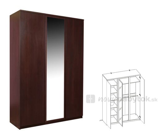 Trojdverová šatníková skriňa doplnená o zrkadlo, ktoré je umiestnené na stredných dverách. V ľavej časti ponúka priestor s policami a v časti pravej voľný priestor s vešiakovou tyčou.