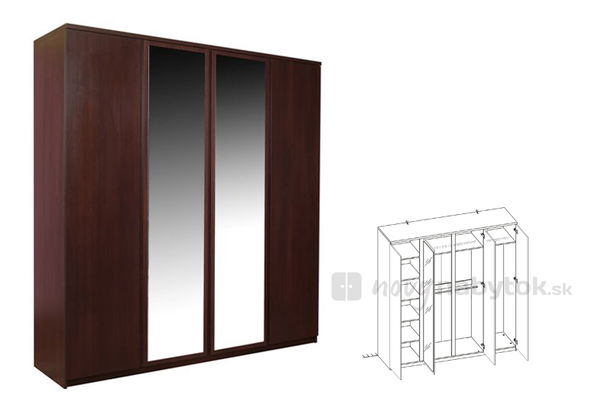 Štvordverová šatníková skriňa so zdrkadlami umiestnenými na stredných dverách. Za ľavými dverami sú poličky. Ostatný priestor je určený na zavesenie oblečenia.