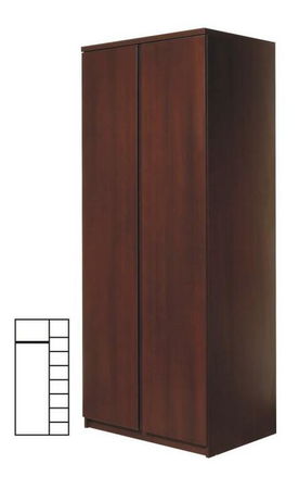 Dvojdverová šatníková skriňa rozdelená na dve časti, pričom pravá časť obsahuje štyri poličky a vľavo sa nachádza vešiaková časť.
