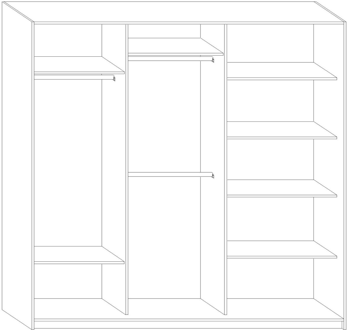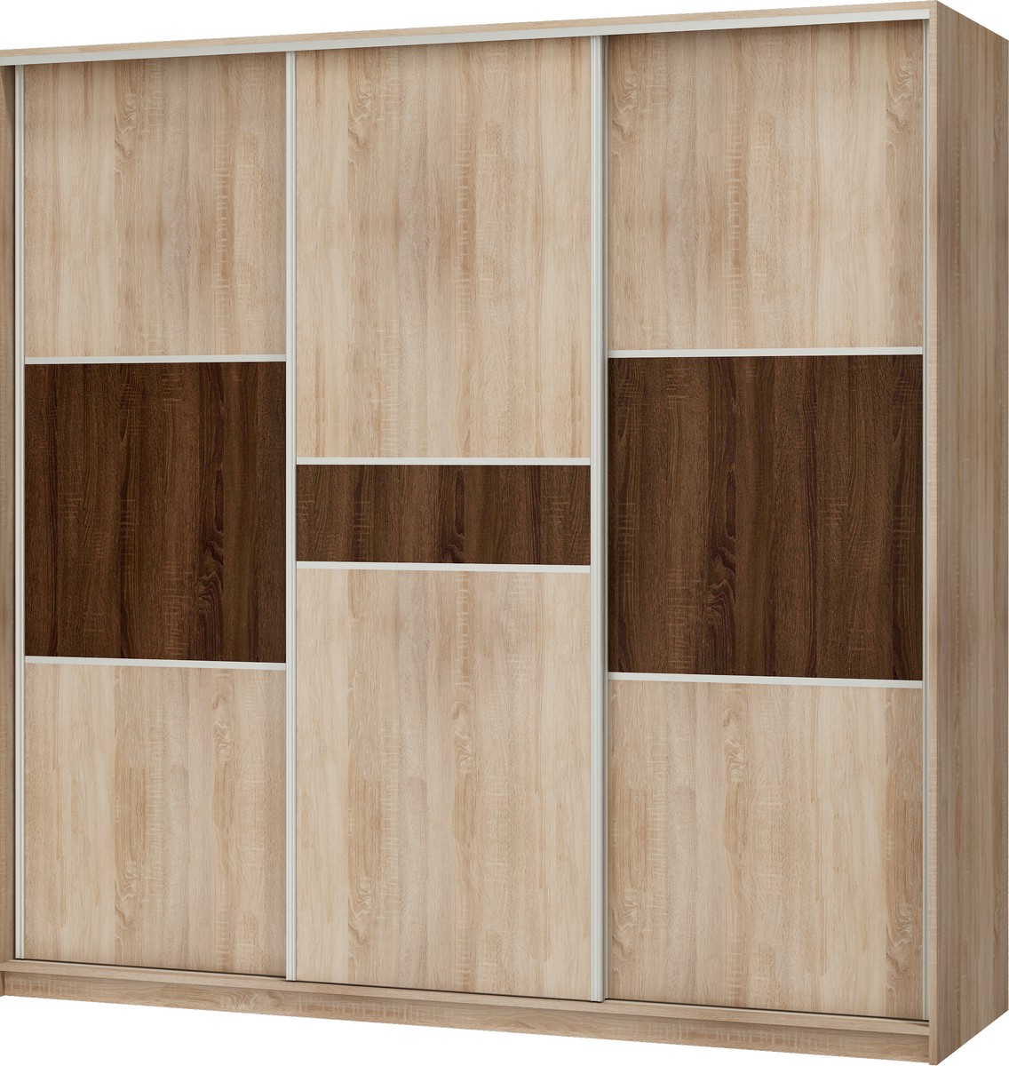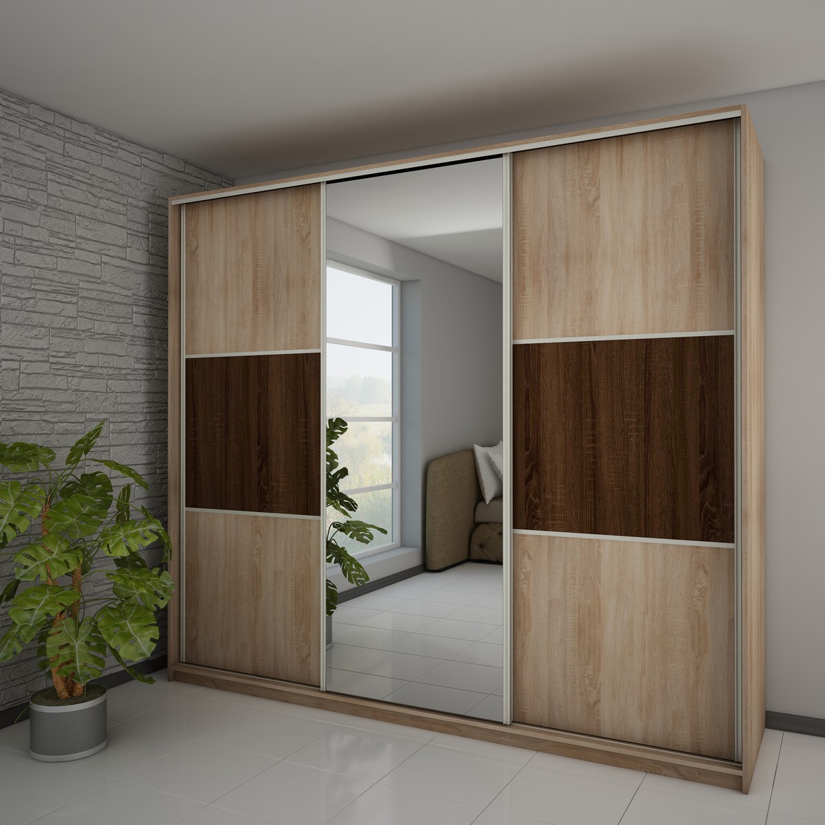 Šatníková skriňa Retford 220 D výška 216 cm hĺbka 65 cm Dub Sonoma svetlá + Dub Sonoma tmavá je elegantná a ponúka veľa úložného priestoru. Táto skriňa má tri posuvné dvere a vo vnútri sa nachádza pod poličkou vešiaková tyč v ľavej a strednej časti. V strede sú dve vešiakové tyče, jedna v strede a jedna pod hornou poličkou. Na spodku ľavého dielu sa nachádza jedna polička a na pravej strane vnútra sú umiestnené 4 poličky. Korpus skrine je v prevedení dub sonoma svetlá a pásy a štvorec na dverách sú v prevedení dub sonoma tmavá. Táto šatníková skriňa je dokonalým doplnkom vášho interiéru a poskytne dostatok úložného priestoru na vaše oblečenie a doplnky.