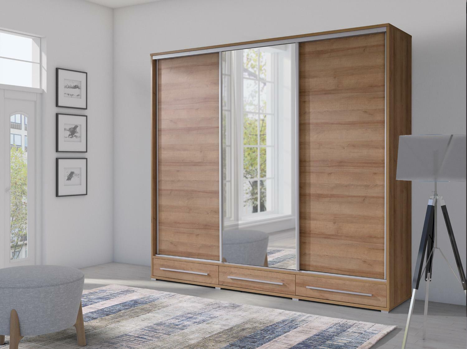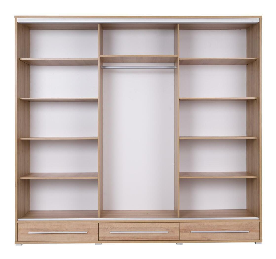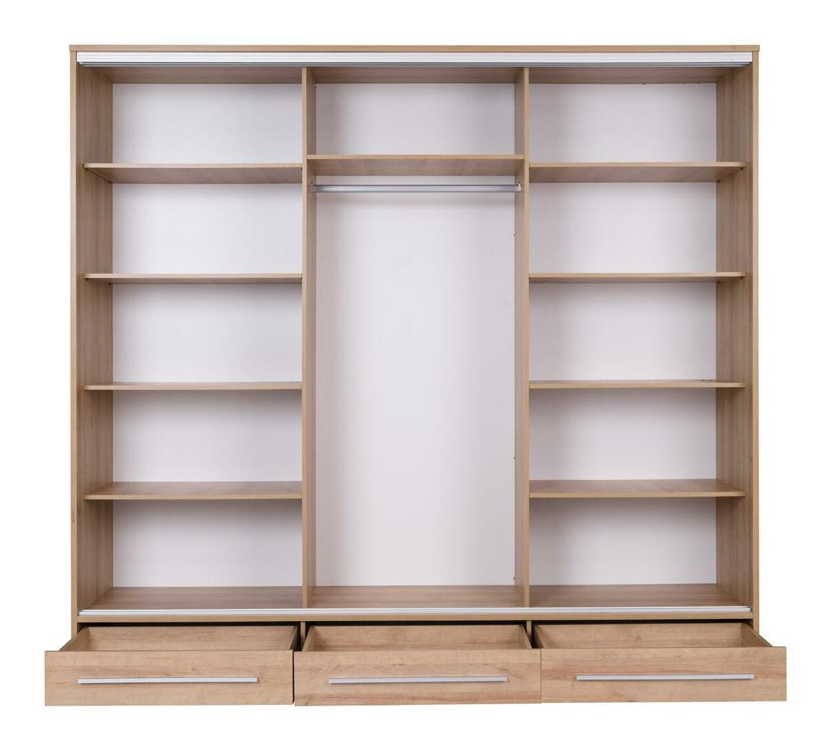 Trojdielna konštrukcia skrine je doplnená tromi zásuvkami v spodnej časti, ktoré poskytujú dostatok úložného priestoru na oblečenie, doplnky alebo posteľnú bielizeň. Pre dokonalé doladenie interiéru môžete skriňu kombinovať s minimalistickými šatníkovými skriňami, ktoré ponúkajú čistý a moderný vzhľad.