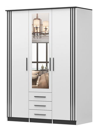 Stylová šatníková skriňa Sabine s praktickým úložným priestorom pre oblečenie a doplnky v optimálne využitom priestore. Tri dvere, stredové sú s zrkadlom pre kontrolu outfitu. Tri zásuvky pre menšie predmety. Tradične otvorené čelá uľahčujú používanie. Ideálna pre hľadajúcich kvalitný nábytok s úložnými možnosťami.