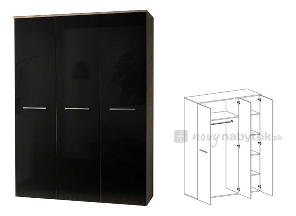 Moderná šatníková skriňa je praktický doplnok k ostatnému nábytku vo Vašej obývacej izbe, predsieni, spálni, pracovni či kancelárii. Skriňa je trojdverová, pričom v ľavej časti sa nachádza vešiaková tyč, ktorá je umiestnená pod poličkou. V pravej časti sú štyri poličky. Je vyrábaná vo viacerých farebných kombináciách a tak si určite nájdete tú vhodnú skriňu, ktorá dokonale zapadne k Vášmu ostatnému nábytku.