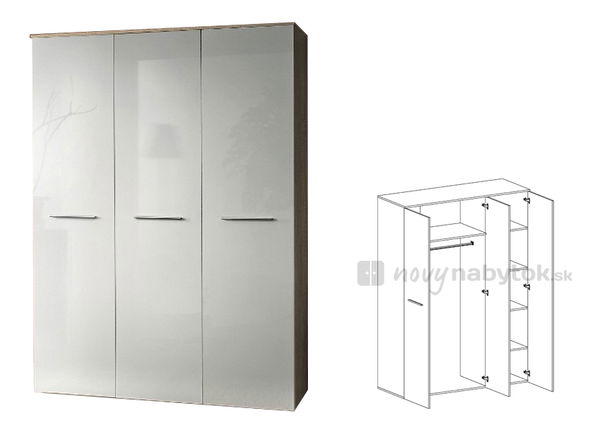 Moderná šatníková skriňa je praktický doplnok k ostatnému nábytku vo Vašej obývacej izbe, predsieni, spálni, pracovni či kancelárii. Skriňa je trojdverová, pričom v ľavej časti sa nachádza vešiaková tyč, ktorá je umiestnená pod poličkou. V pravej časti sú štyri poličky. Je vyrábaná vo viacerých farebných kombináciách a tak si určite nájdete tú vhodnú skriňu, ktorá dokonale zapadne k Vášmu ostatnému nábytku.