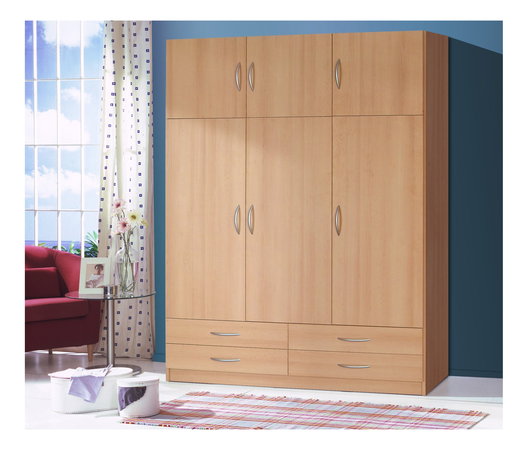 Ak chcete mať poriadok v oblečení, táto priestranná skriňa je určená práve Vám. V spodnej časti sa nachádzajú štyri zásuvky. Nad nimi je v pravej časti skrinka s dvomi poličkami a jednými dvierkami. Na ľavo od nej je jedna dlhá vešiaková tyč. Na vrchu skrine sa nachádza ešte nadstavba s tromi dvierkami. Jednoduchý dizajn a moderná farba dreva buk zaručia, že sa skriňa hodí do každej spálne, šatníka či predsiene.
