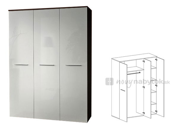 Moderná šatníková skriňa je praktický doplnok k ostatnému nábytku vo Vašej obývacej izbe, predsieni, spálni, pracovni či kancelárii. Skriňa je trojdverová, pričom v ľavej časti sa nachádza vešiaková tyč, ktorá je umiestnená pod poličkou. V pravej časti sú štyri poličky. Je vyrábaná vo viacerých farebných kombináciách a tak si určite nájdete tú vhodnú skriňu, ktorá dokonale zapadne k Vášmu ostatnému nábytku.