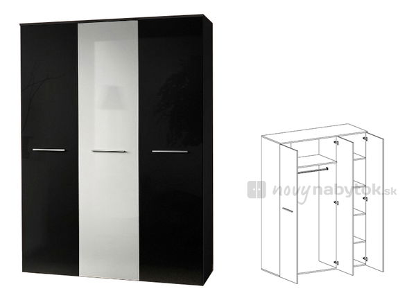 Moderná šatníková skriňa je praktický doplnok k ostatnému nábytku vo Vašej obývacej izbe, predsieni, spálni, pracovni či kancelárii. Skriňa je trojdverová, pričom v ľavej časti sa nachádza vešiaková tyč, ktorá je umiestnená pod poličkou. V pravej časti sú štyri poličky. Je vyrábaná vo viacerých farebných kombináciách a tak si určite nájdete tú vhodnú skriňu, ktorá dokonale zapadne k Vášmu ostatnému nábytku.